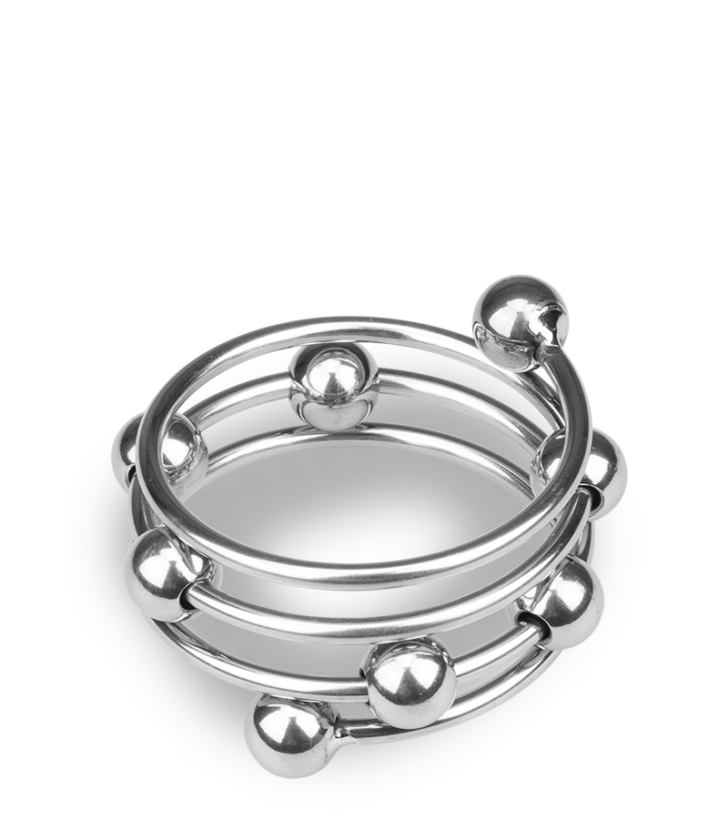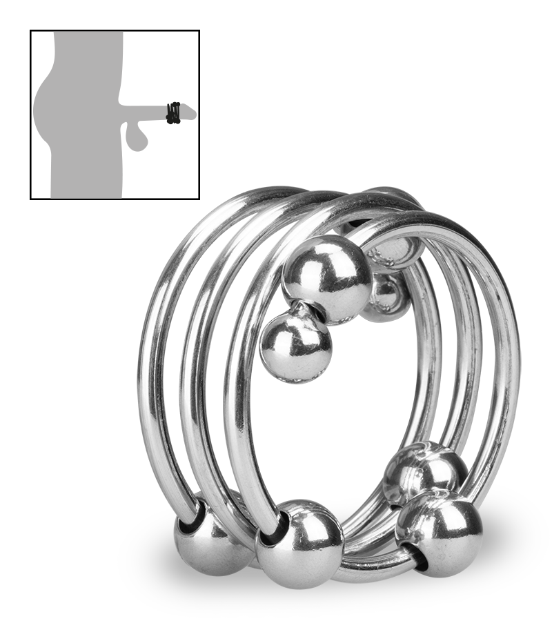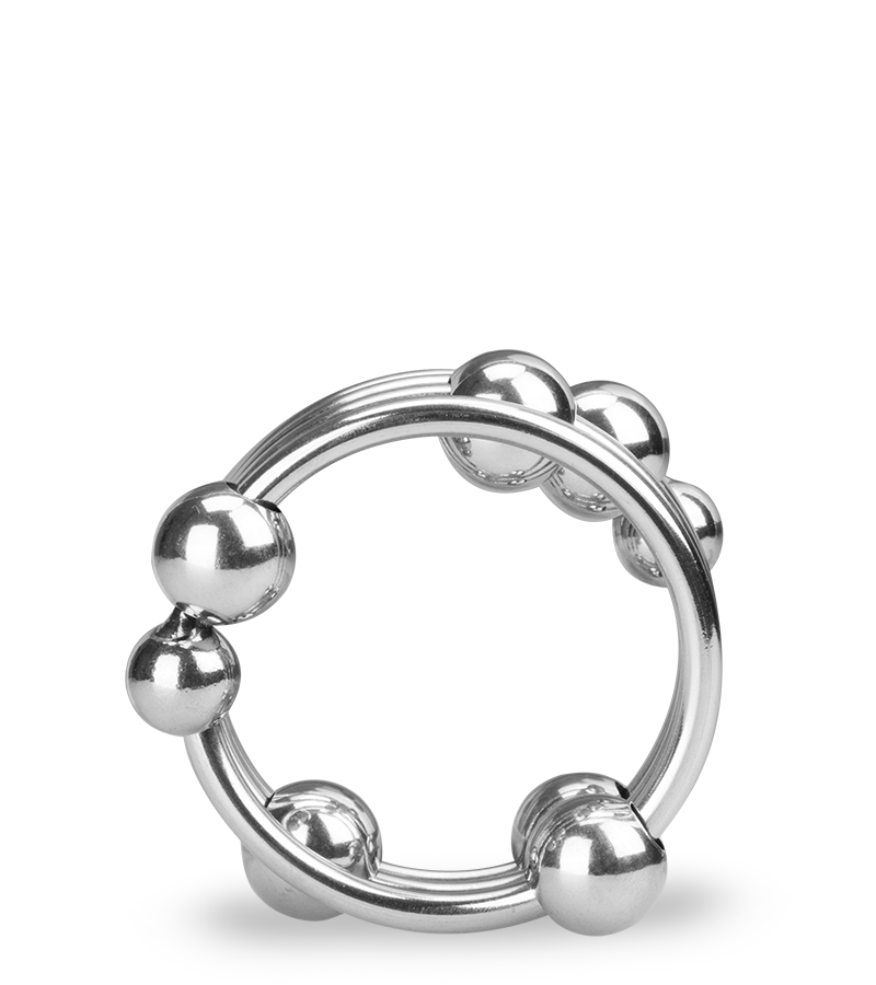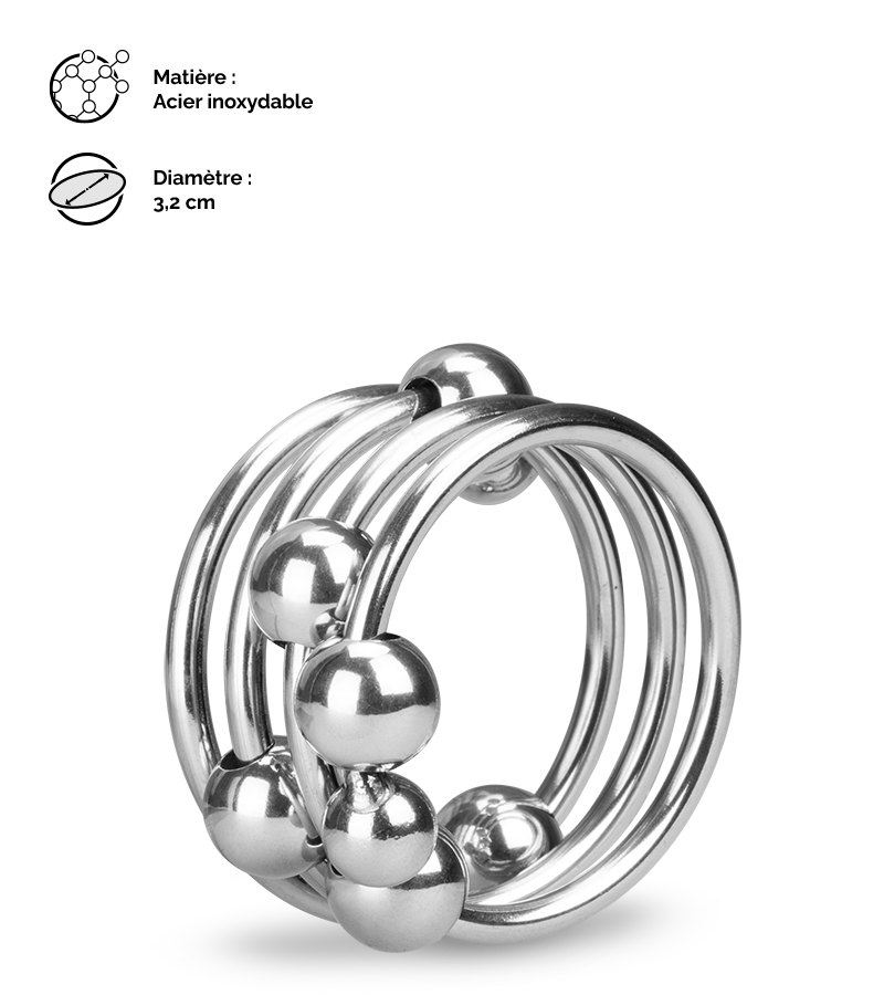 Cet anneau en forme de spirale et en acier inoxydable possède donc huit boules, deux aux extrémités et six qui peuvent se déplacer sur la longueur du cockring.