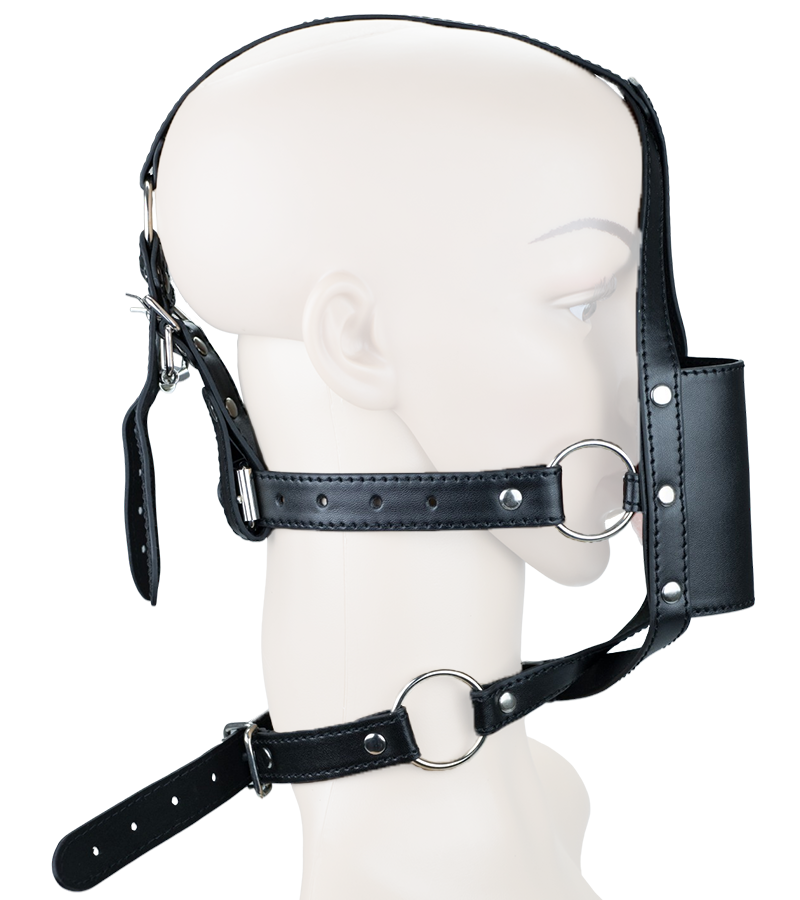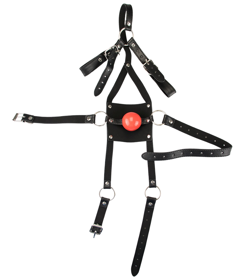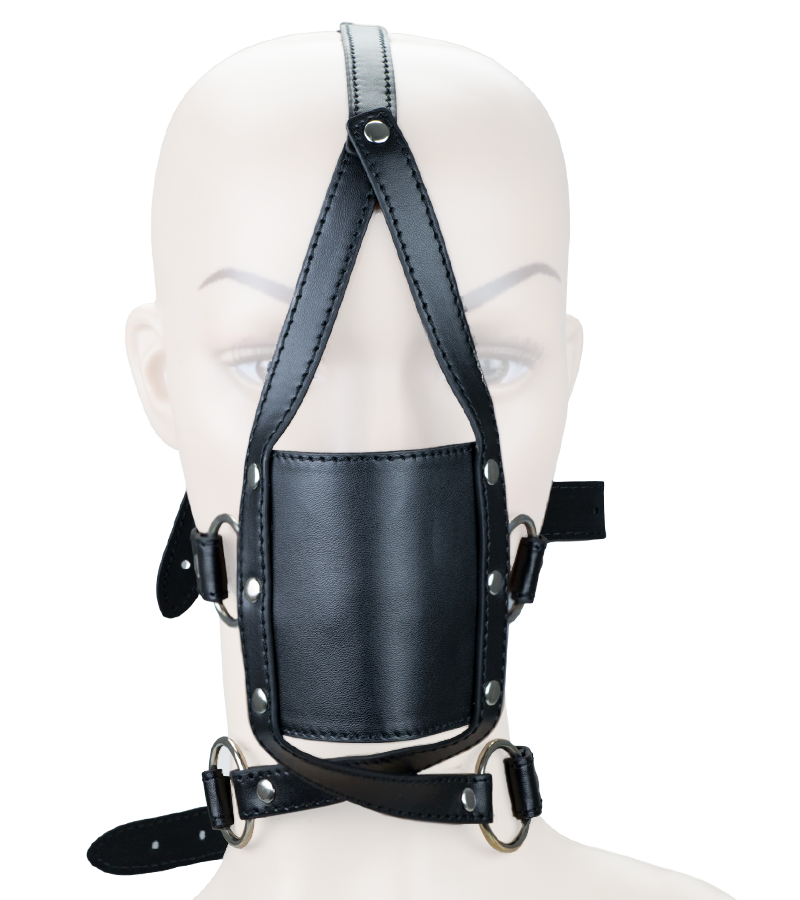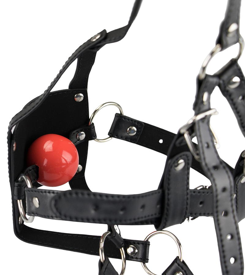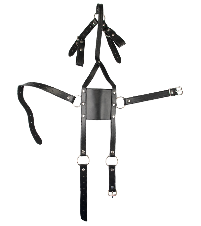 Ce sextoy BDSM se compose d’un masque et de lanières en simili cuir rehaussés de rivets et boucles en métal argenté. L’intérieur est doublé de velours pour un contact doux avec la peau.