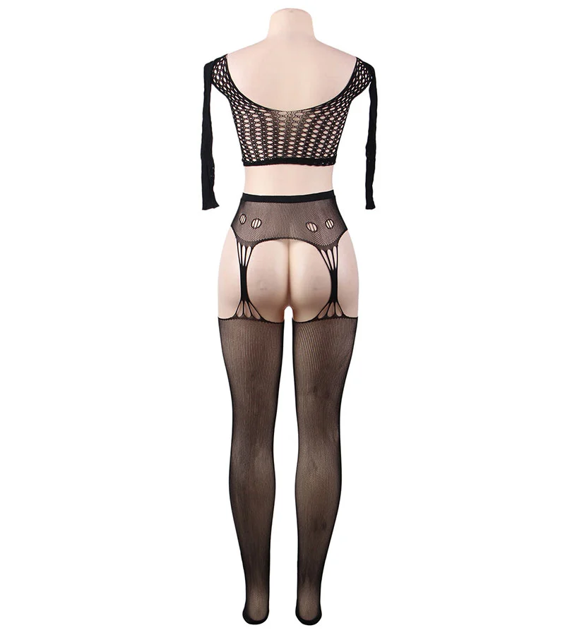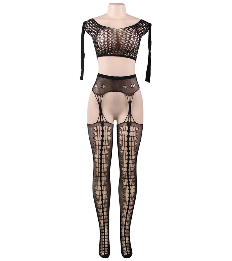 L’autre partie de cette combinaison deux-pièces comprend des bas reliés à une jarretelle taille haute. Les bas sont parés de motifs et ouvertures verticales qui allongent la jambe pour vous mettre en valeur. La jarretelle est travaillée dans les détails, avec des effets de laçage et ouvertures très sexy.