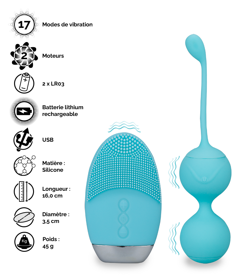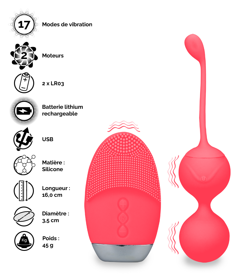 Les boules de geisha fonctionnent avec une batterie rechargeable avec le câble USB fourni. Elles mesurent 16,0 cm de longueur totale dont 8,0 cm insérables et pèsent 45 g. Le diamètre des boules est de 3,5 cm.