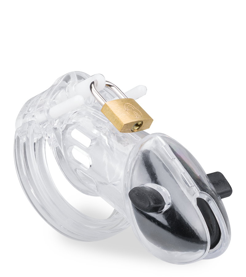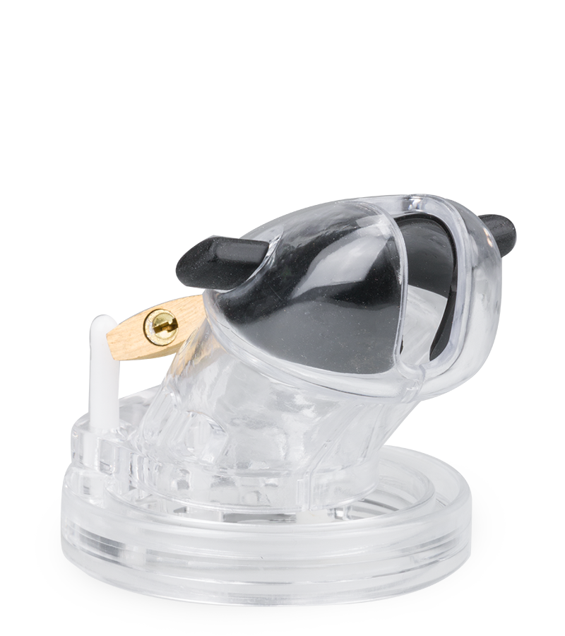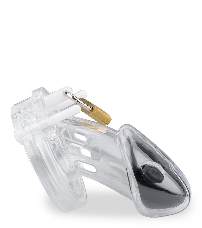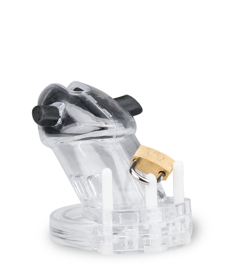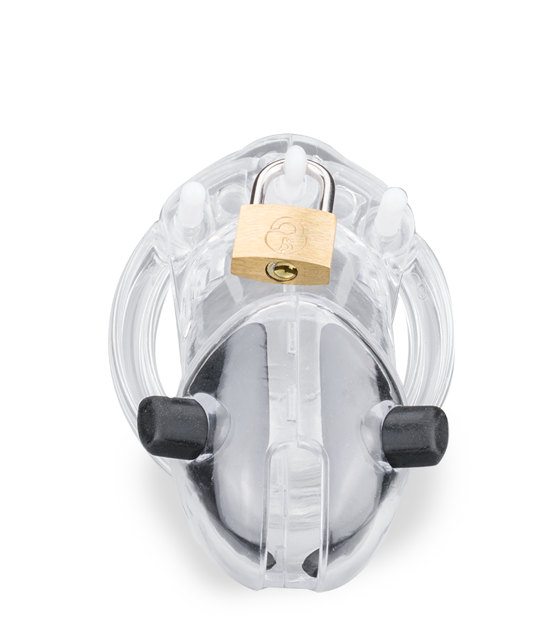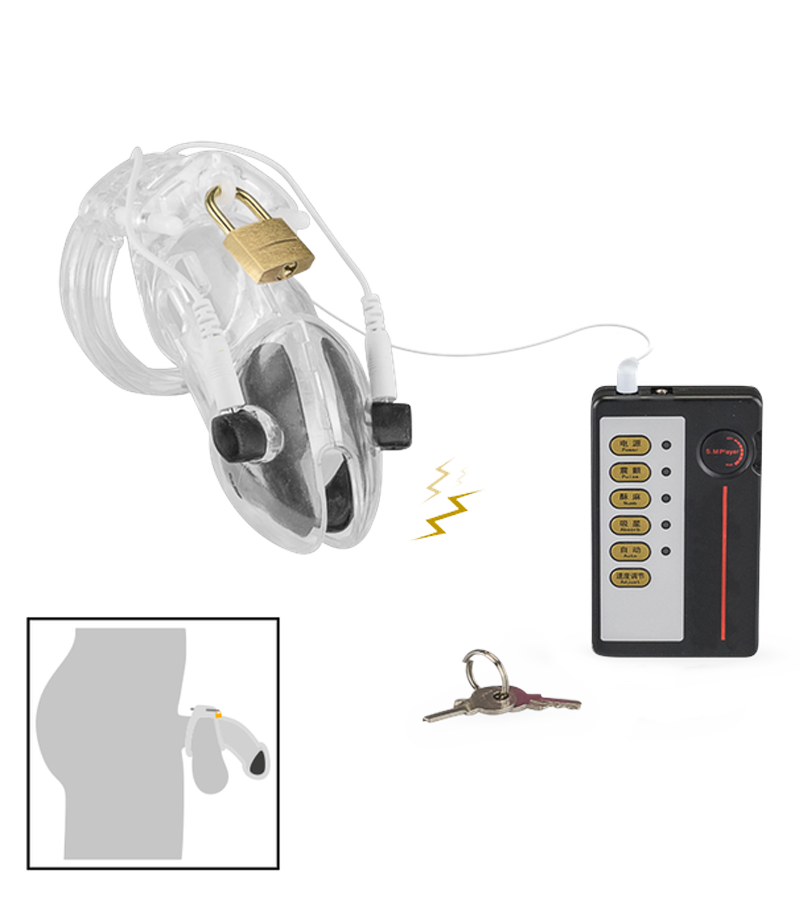 Emprisonnez votre pénis et contrôlez votre plaisir avec cette cage chasteté électro stimulation transparente.