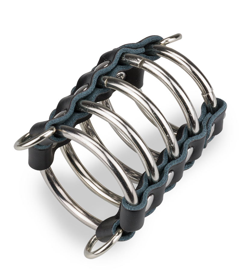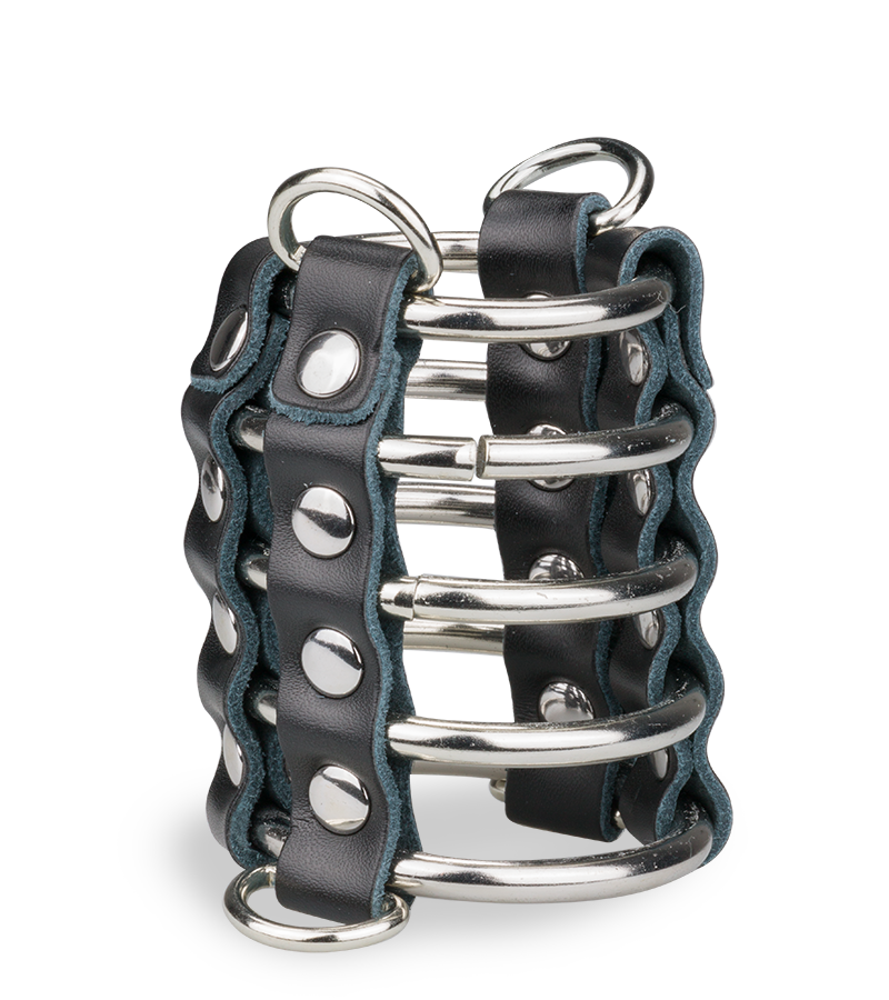 Cet accessoire BDSM par excellence permet d’enserrer le pénis en érection qui vient toucher les parois froides et métalliques de la cage alors que les lanières en cuir entourent et serrent la base des testicules.
