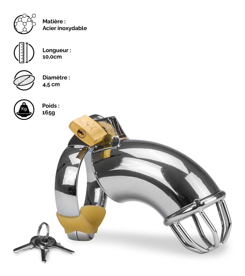 La cage de chasteté homme Turtleneck est conçue en acier inoxydable et est vendue avec un cadenas et trois clefs. Elle mesure 10,0 cm de longueur totale, son anneau de maintien a un diamètre de 4,5 cm.