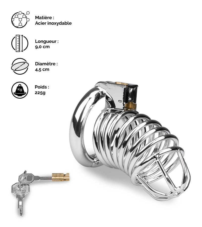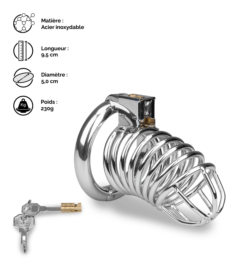 Dimensions du modèle L : longueur totale de 9,5 cm et longueur insérable de 8,5 cm – diamètre extérieur/intérieur de l’anneau de 6,5 cm / 5,0 cm – diamètre intérieur de la cage de 3,4 cm.