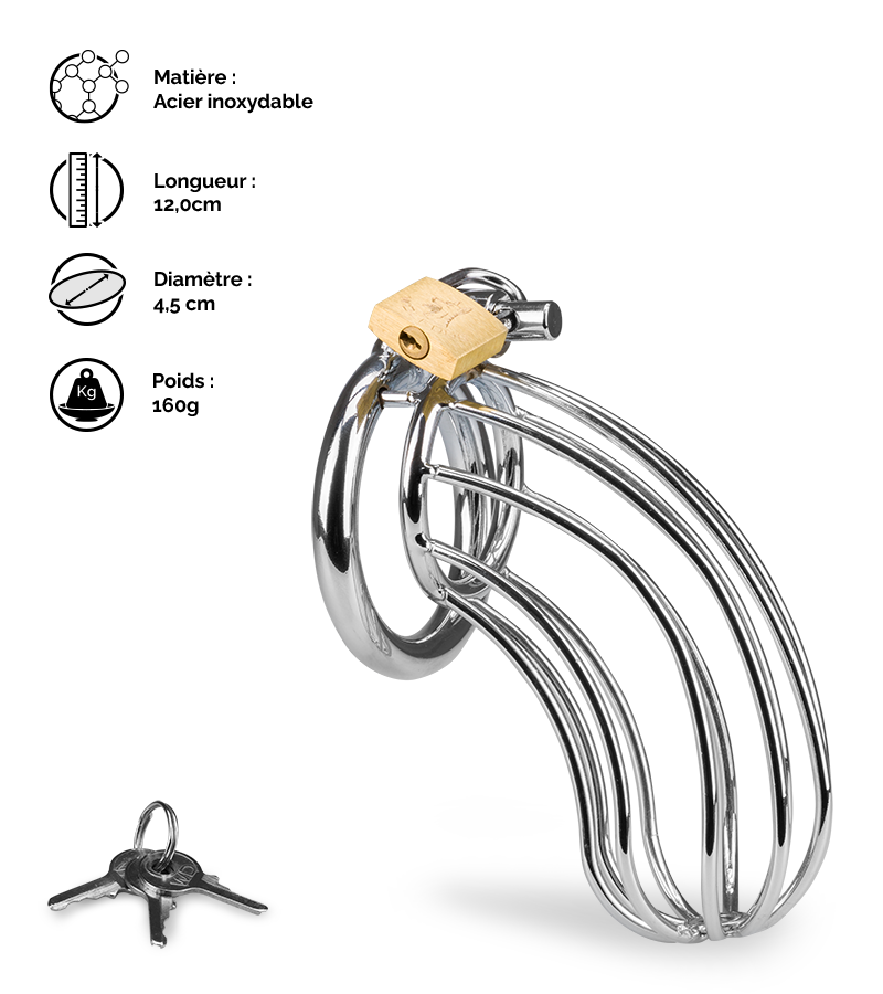 Une fois votre pénis derrière les barreaux, il vous sera impossible de déroger à votre promesse d’abstinence… Votre maître uniquement pourra vous libérer grâce au jeu de 3 clefs qu’il pourra garder en sa possession. Ce modèle est plus long que les autres pour convenir aux pénis imposants ou pour plus de confort. Courbé et ajouré, il ne vous laissera aucune chance de développer entièrement une érection sans ressentir d’inconfort, mais vous pourrez uriner normalement. La cage est vendue avec un cadenas et un jeu de 3 clefs. La cage de chasteté Sentence mesure 12,0 cm de longueur totale. Le diamètre de son anneau de maintien est de 4,5 cm pour la taille M et de 5,0 cm pour la taille L.
