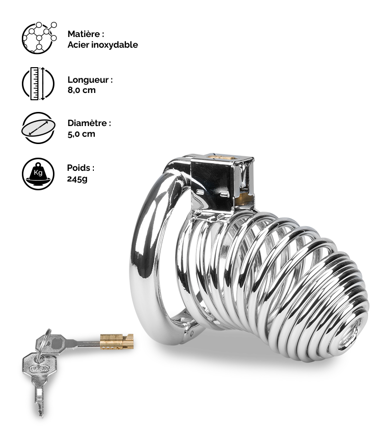 Deux modèles sont disponibles, taille M et L. Dans tous les cas, la cage mesure 3,4 cm de diamètre intérieur et 8,0 cm de long au total, dont une partie insérable de 7,5 cm.