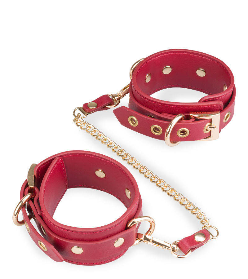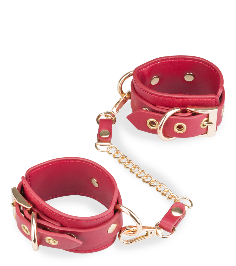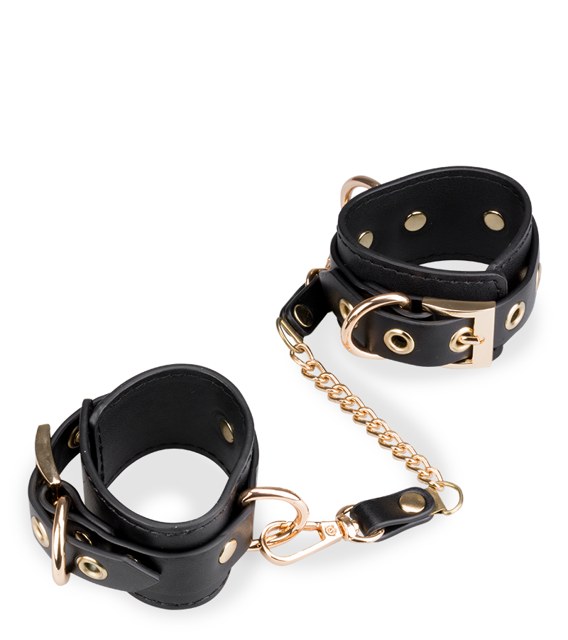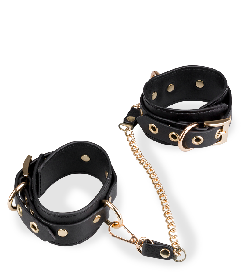 - 1 paire de menottes pour attacher les chevilles. Elles sont aussi réglables et conviennent jusqu’à 26,0 cm de tour de cheville. Une chaine de 25,0 cm est fournie pour relier les menottes ensemble.