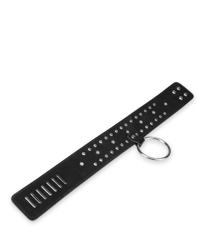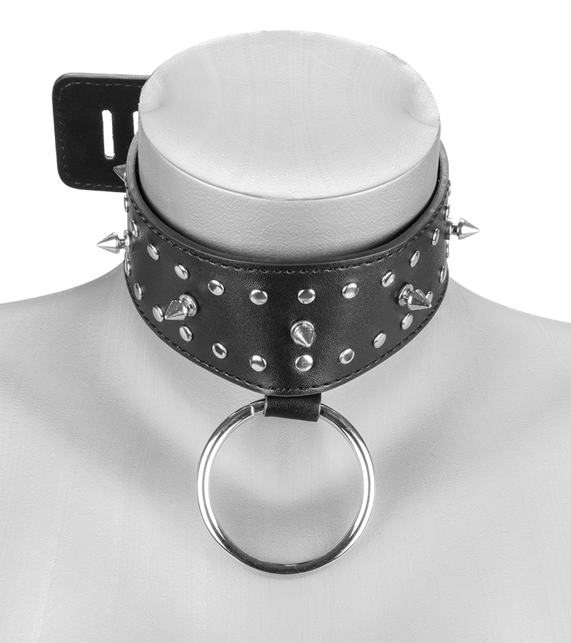 Ce collier en simili cuir noir et aux détails de rivets et de pointes métalliques sera du plus bel effet lors de jeux bondage et de soumission. Son intérieur est doux et permettra un port confortable. Un anneau large permet d’y attacher des accessoires : laisse (que vous pourrez trouver en option), chaine, etc…Et de dominer entièrement votre partenaire. Il est réglable sur 7 crans pour s’adapter au cou et se ferme à l’aide d’un cadenas livré avec deux clés.