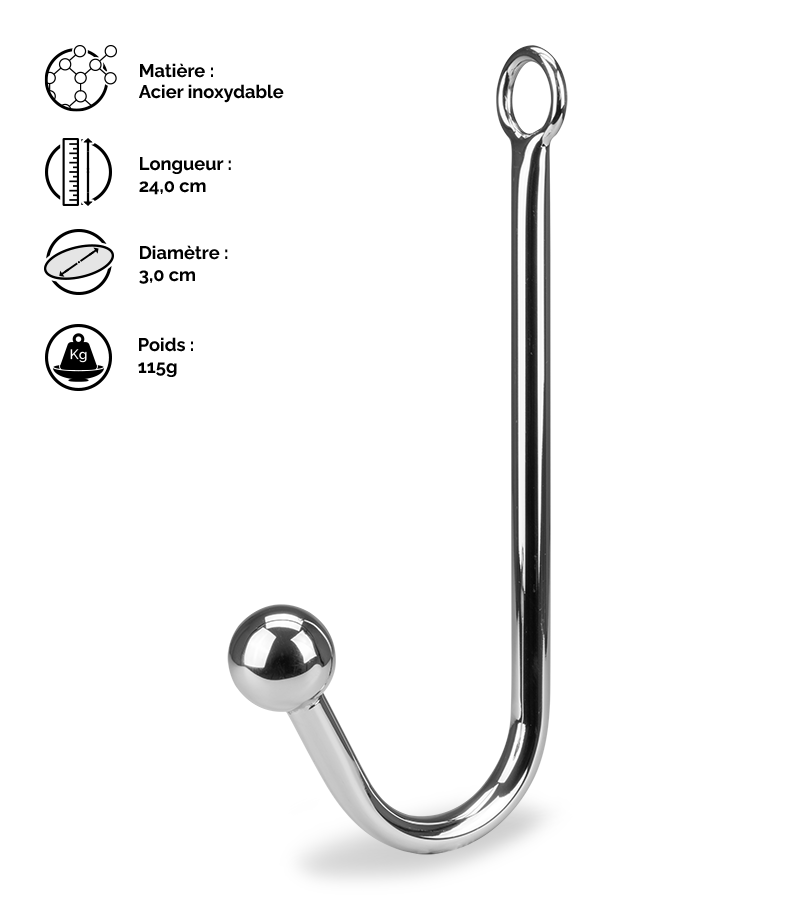 Ce crochet possède une boule à insérer dans l’anus ainsi qu’un anneau à son autre extrémité pour pouvoir l’attacher à vos équipements de bondage. De cette façon, le soumis ressentira des sensations extrêmes, ce qui excitera à coup sûr son maitre.