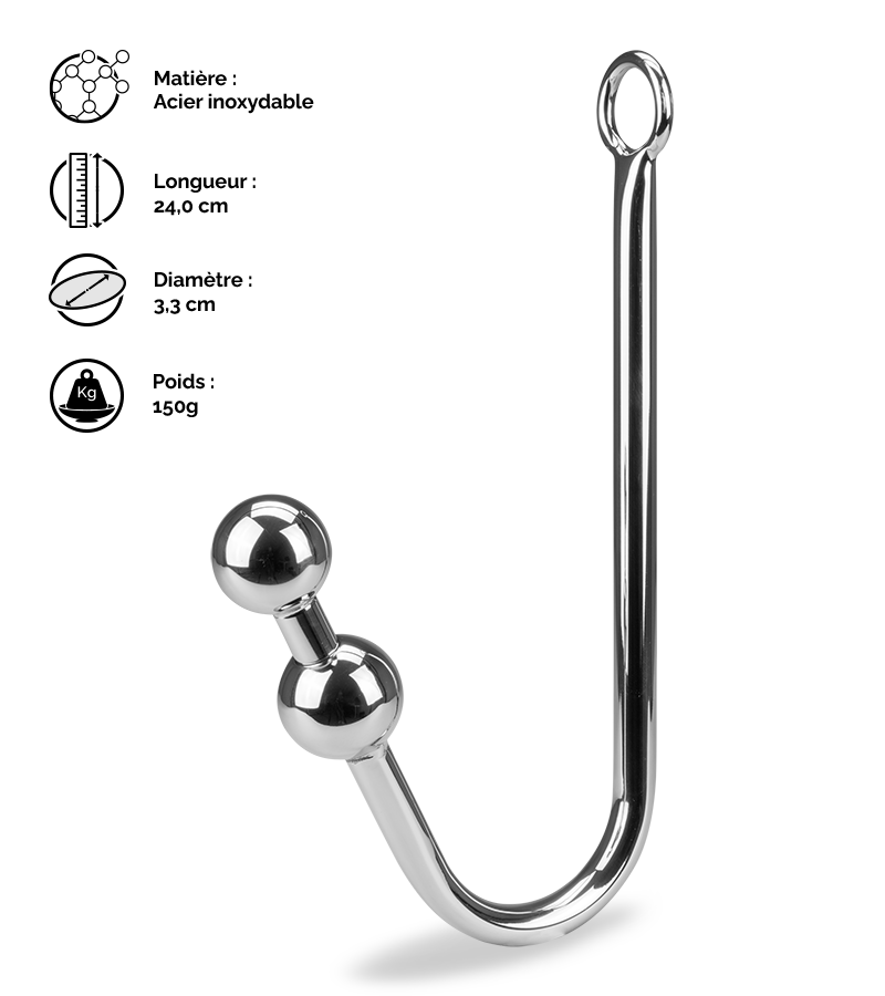 Ce crochet sera parfait comme accessoire pour pimenter vos jeux BDSM. Il possède deux boules à insérer afin de délivrer des sensations intenses et jouissives à chaque mouvement à la personne qui le portera. Vous pourrez facilement l’accrocher à vos équipements de bondage avec l’anneau de 2 cm de diamètre présent à son extrémité.