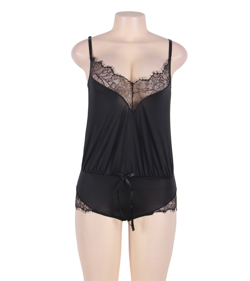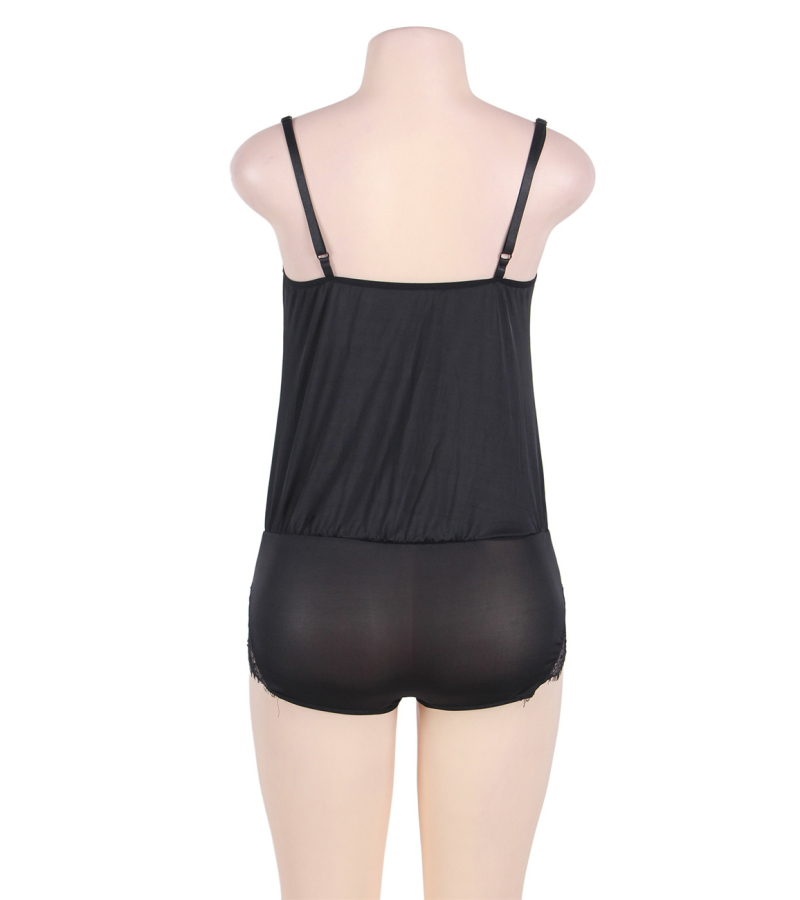 Ce déshabillé sexy revêt une allure de combishort tout en gardant quelques détails coquins qui rendent ses lettres de noblesse à ce vêtement de nuit. Il est décoré de dentelle fine à franges sur la poitrine et sur la culotte, deux zones hautement sexy. La dentelle présente sur le décolleté mettra en valeur les seins d’une façon terriblement érotique. Ce vêtement de nuit est peu moulant, vous vous sentirez à votre aise dans cette tenue sexy qui peut tout à fait convenir en tant que vêtement commun. Disponible en grande taille (en fonction des stocks).