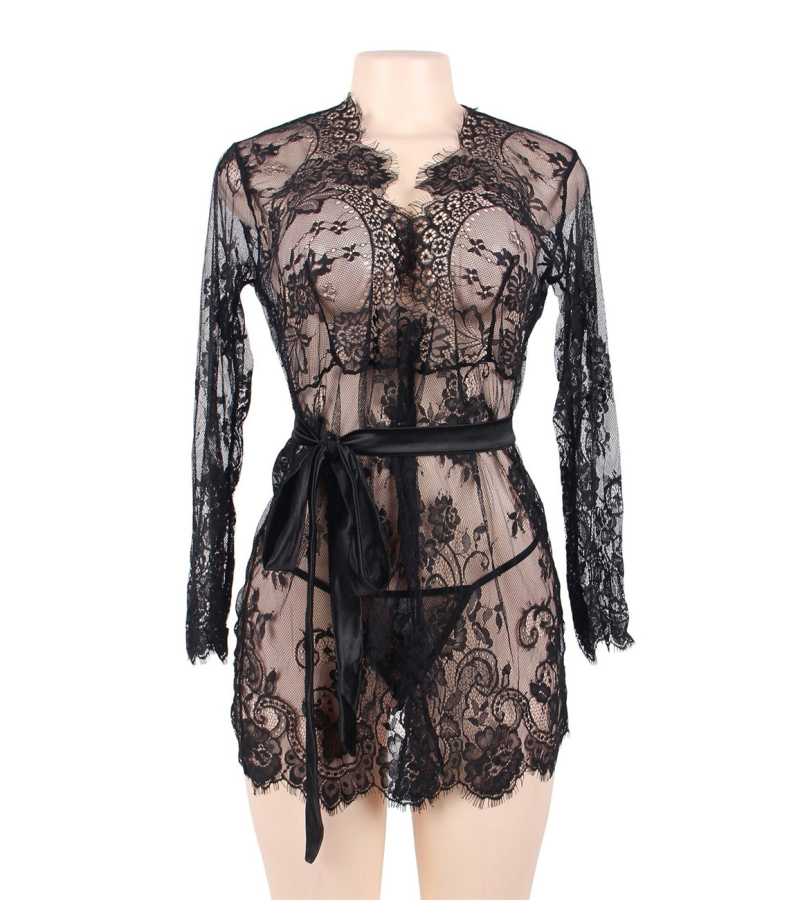 Le déshabillé sexy en dentelle à fleurs est un vêtement de nuit qui possède l’atout de pouvoir être utilisé au quotidien et de permettre de faire basculer chaque moment en instant coquin. Il s’agit là d’un déshabillé léger, maintenu au corps par une ceinture nouée et vendu avec un string assorti. Ce déshabillé à manches longues tombantes possède un décolleté en V en dentelle du plus bel effet. Le reste de ce vêtement de nuit est confectionné dans de la dentelle transparente à motifs fleuris. Il existe en deux couleurs passionnelles (noir et rouge) et en plusieurs tailles, notamment en grande taille.