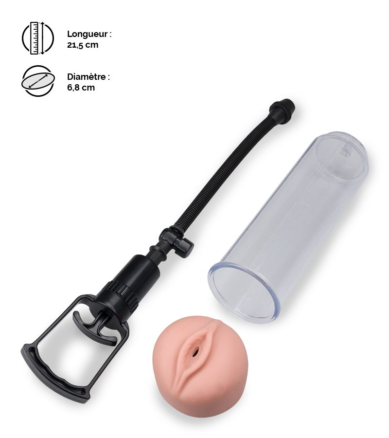 Après avoir inséré votre sexe en érection dans le tube préalablement équipé de l’insert vagin, vous n’aurez plus qu’à pomper avec la poignée pour y aspirer l’air et ainsi pouvoir observer votre pénis gonfler. Le tube transparent est gradué pour vous permettre de constater précisément l’évolution de votre sexe. L’insert vagin fourni vous apportera beaucoup de confort et boostera votre désir pour que vous puissiez donner le meilleur de vous-même. Le développeur de pénis Raiser fait 23,2 cm de longueur, 6,7 cm de diamètre externe, 6,3 cm de diamètre interne et offre une profondeur d’insertion de 21,0 cm.