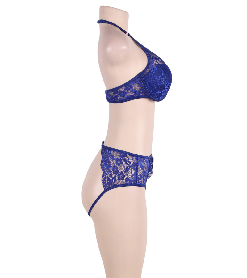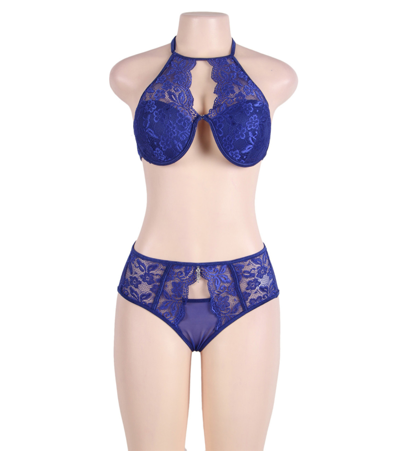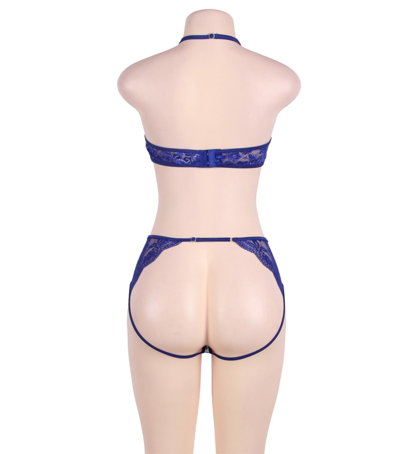 L’ensemble sexy bleu comprend des sous-vêtements en dentelle complexe et au design original. La culotte a comme spécificité une ouverture au-dessus de l’entrejambe surplombée par un bijou, mais son point fort se cache à l’arrière. En effet, cette culotte string ne passe pas par le sillon interfessier, ce sont deux fines bretelles traversant vos fesses en diagonale qui viendront maintenir cette lingerie coquine. Le soutien-gorge est tout aussi sophistiqué. Ce soutien-gorge bas fait le tour du cou afin d’offrir une ouverture au-dessus des seins. Également disponible en grande taille, cet ensemble sexy est aussi parfait pour les femmes rondes.