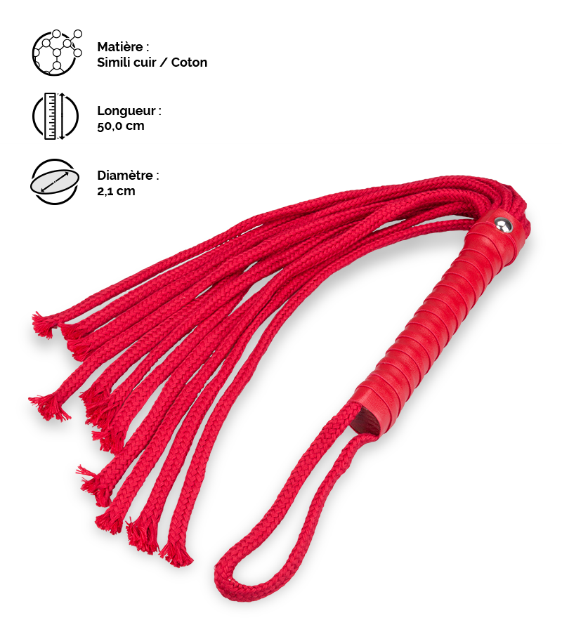Initiez-vous en douceur au BDSM avec ce fouet à lanières en coton ! Idéal pour des punitions non douloureuses, ce fouet vous permettra de profiter de toute l’excitation que procurrent les gestes BDSM sans risquer de vous blesser. Vous pourrez caresser votre partenaire avec les lanières ou mettre des coups plus violents pour pimenter vos jeux sans brusquer. Une dragonne vous permet de maintenir votre fouet autour du poignet si vous souhaitez utiliser temporairement un autre accessoire. La poignée en simili cuir rouge est assortie aux lanières en coton pour un look fatal. Le fouet martinet à lanières rouge mesure 50,0 cm de long et 2,1 cm de diamètre.