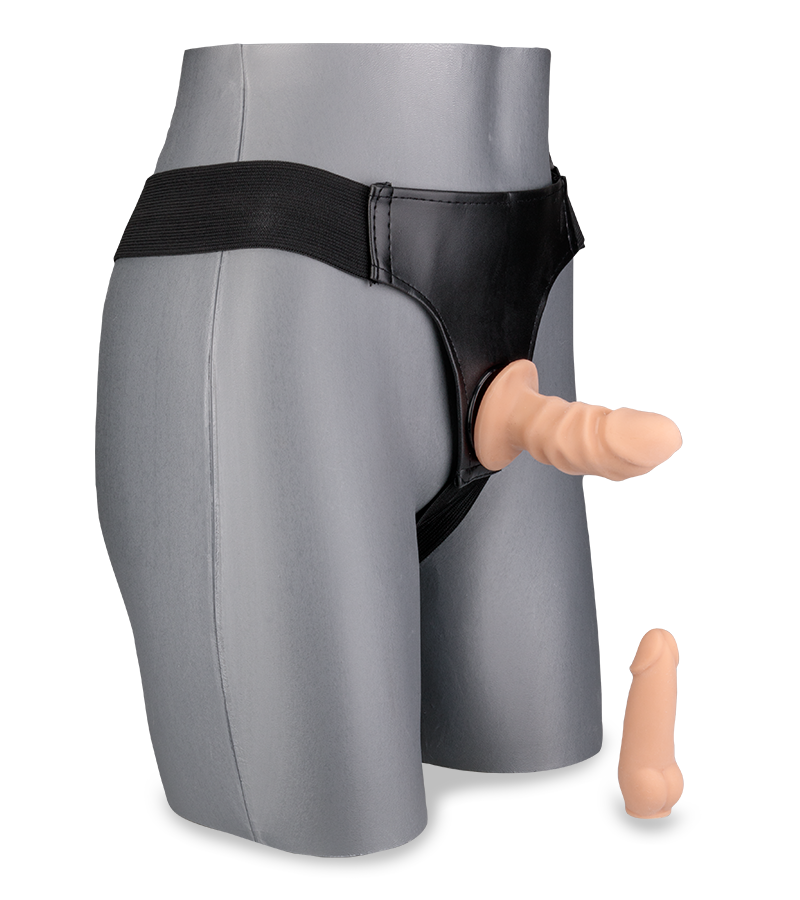 Le premier gode déjà intégré au harnais est un petit gode légèrement courbé, qui mesure 11,0 cm de long pour une longueur insérable de 9,0 cm et un diamètre de 3,6 cm. Il est pourvu d’un gros gland ainsi que de nombreuses nervures en relief. Le second, plus petit, mesure 10,0 cm de long pour un diamètre de 2,6 cm avec une longueur insérable de 7,0 cm.