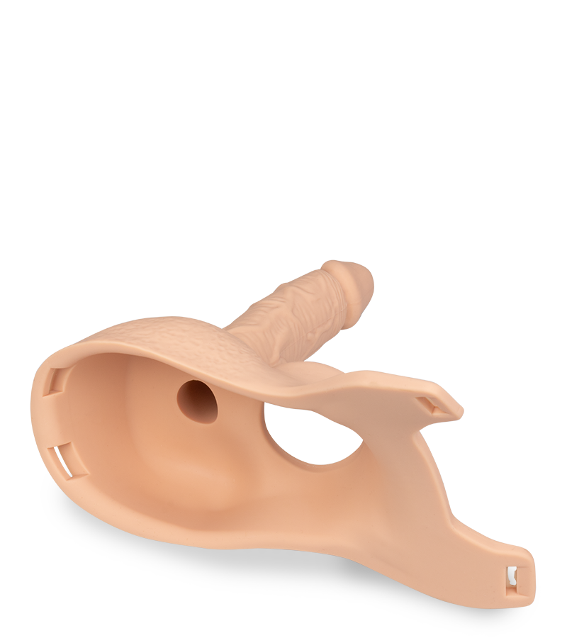 1. Attachez la partie supérieure du gode au harnais grâce aux deux plus petites attaches en les faisant se rejoindre avec les boutons à pression