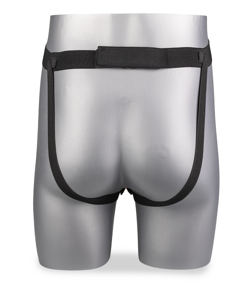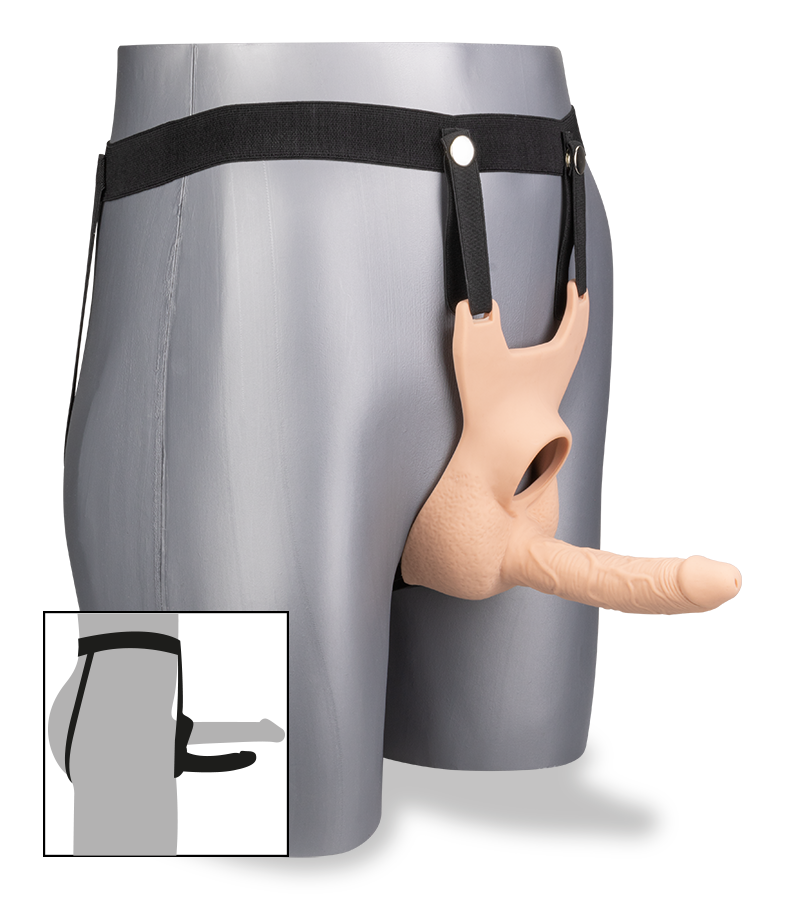 3. Faites passer les deux plus grandes attaches entre vos jambes puis faites-les remonter devant vous avant de les joindre à la partie inférieure du gode