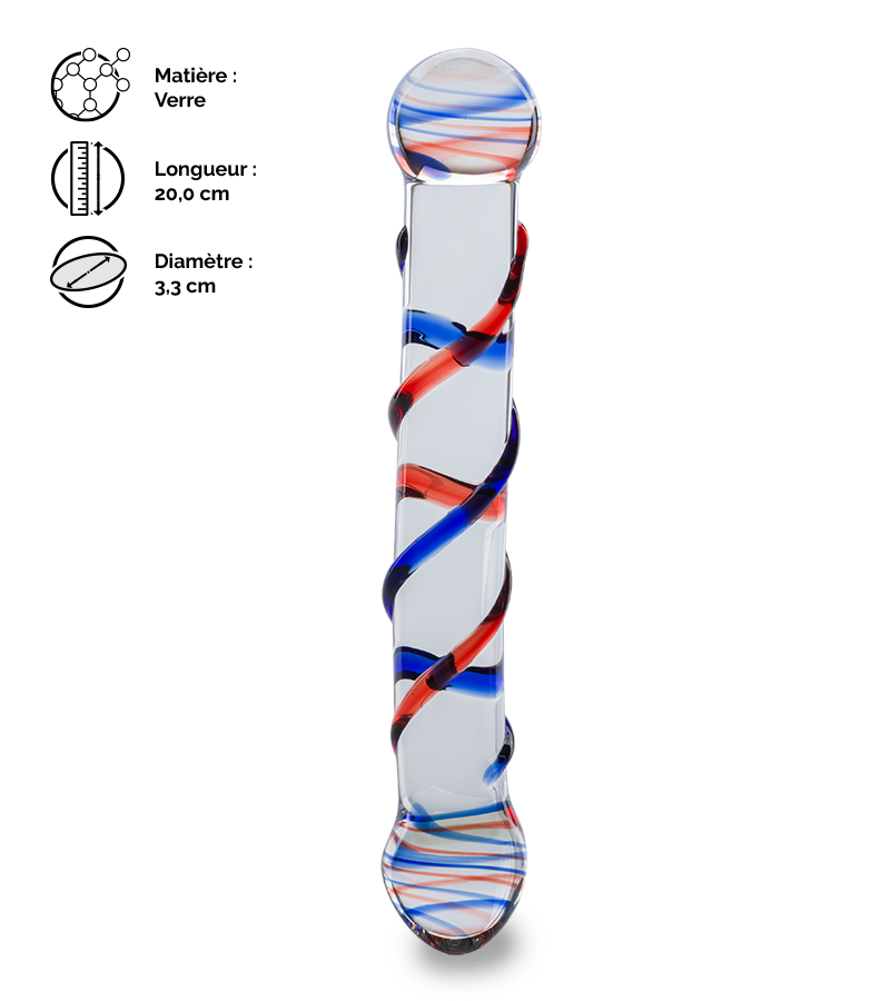 Les reliefs de teintes bleue et rouge s’enroulant autour de ce jouet vous charmeront, tout en vous amenant à l’apogée du plaisir. Sa forme légèrement courbée est terminée par un gland d’un côté et une boule de l’autre. Il vous sera ainsi plus agréable de tenir votre sextoy en main. Il est fabriqué en verre totalement transparent et durable, en plus d’être hypoallergénique. Pour pimenter la pénétration avec ce magnifique gode, vous pourrez le plonger dans de l’eau froide ou tiède avant de l’utiliser. Il vous offrira un effet totalement différent selon sa température.