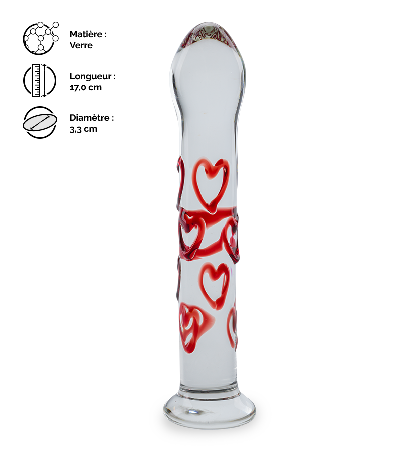Ce jouet transparent est décoré de jolis petits cœurs en reliefs et teintés de rouge pour lui donner le design le plus mignon possible. Son bout légèrement plus large pressera votre intimité lors de la pénétration pour vous faire découvrir de nouvelles sensations. Fabriqué en verre, il est non poreux, hypoallergénique et peut changer de température ! Pour cela, immergez votre gode dans de l’eau froide ou tiède avant de l’utiliser… Un effet totalement inédit vous surprendra et vous comblera de satisfaction.