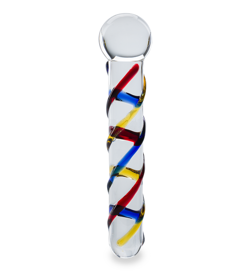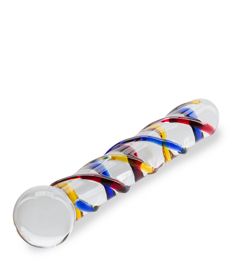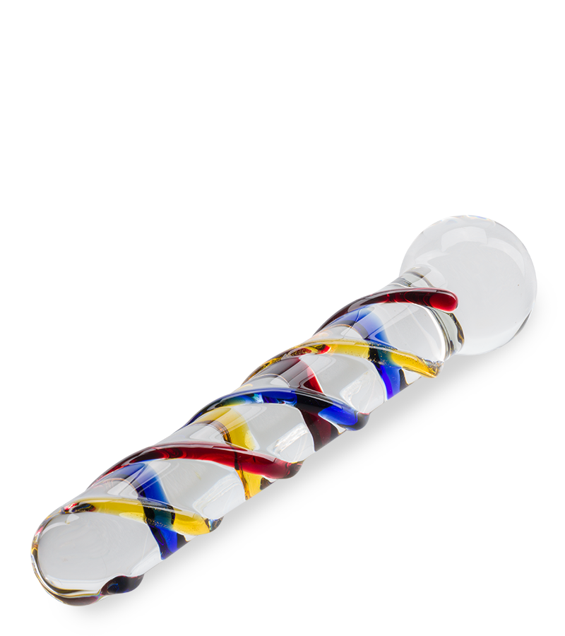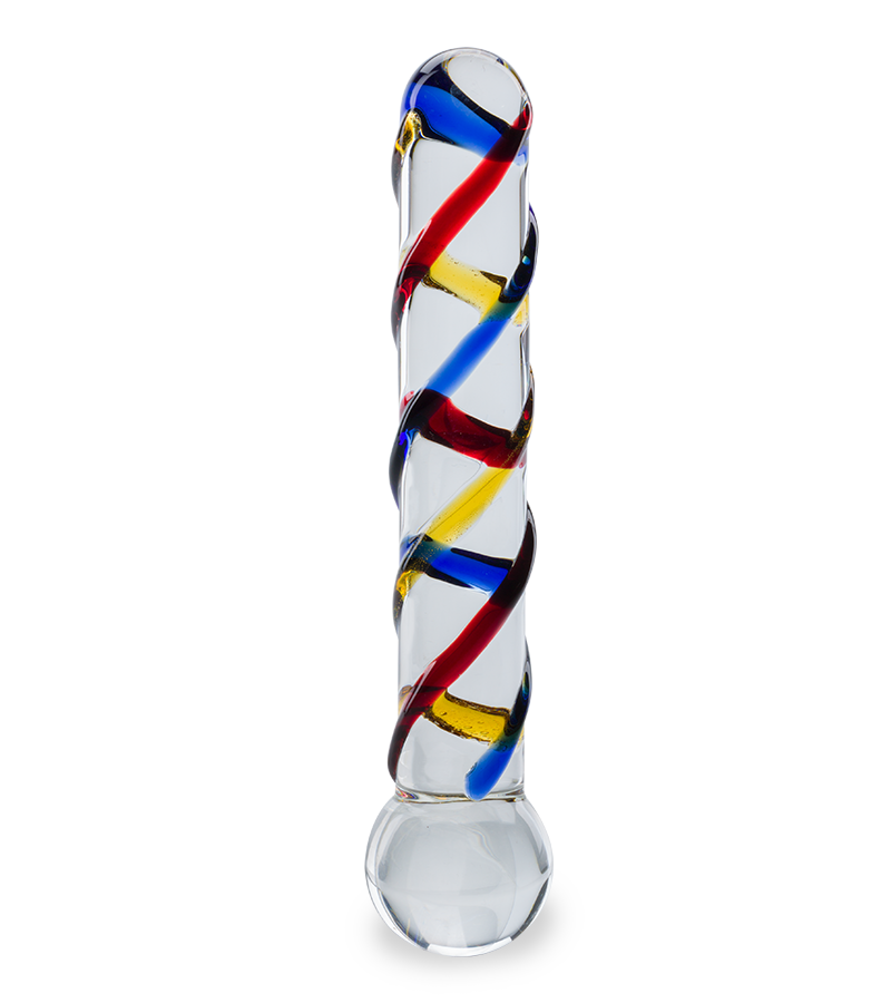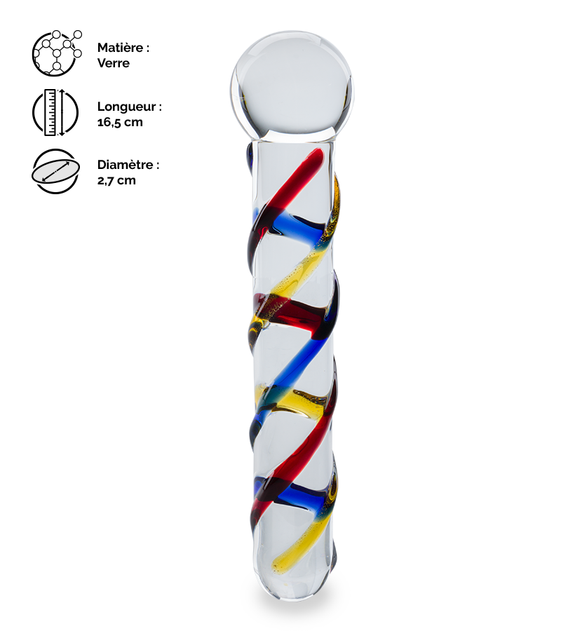 Les avantages du verre sont nombreux : ce matériau non poreux est hypoallergénique et s’entretient facilement. De plus, il est entièrement transparent et transforme les sextoys en objets design ! Ce gode allie ainsi une utilisation facile a une esthétique surprenante. Trois lignes teintées en bleu, rouge et jaune en font le tour, sous forme de légers reliefs qui ajouteront des sensations à vos mouvements. Ce sextoy au matériau dur massera délicatement votre intimité au rythme des va-et-vient, vous procurant une excitation sans pareille. Jouez aussi avec les températures : placez-le dans de l’eau tiède ou froide avant de l’utiliser et il prendra la température de l’eau pour vous procurer des sensations supplémentaires.
