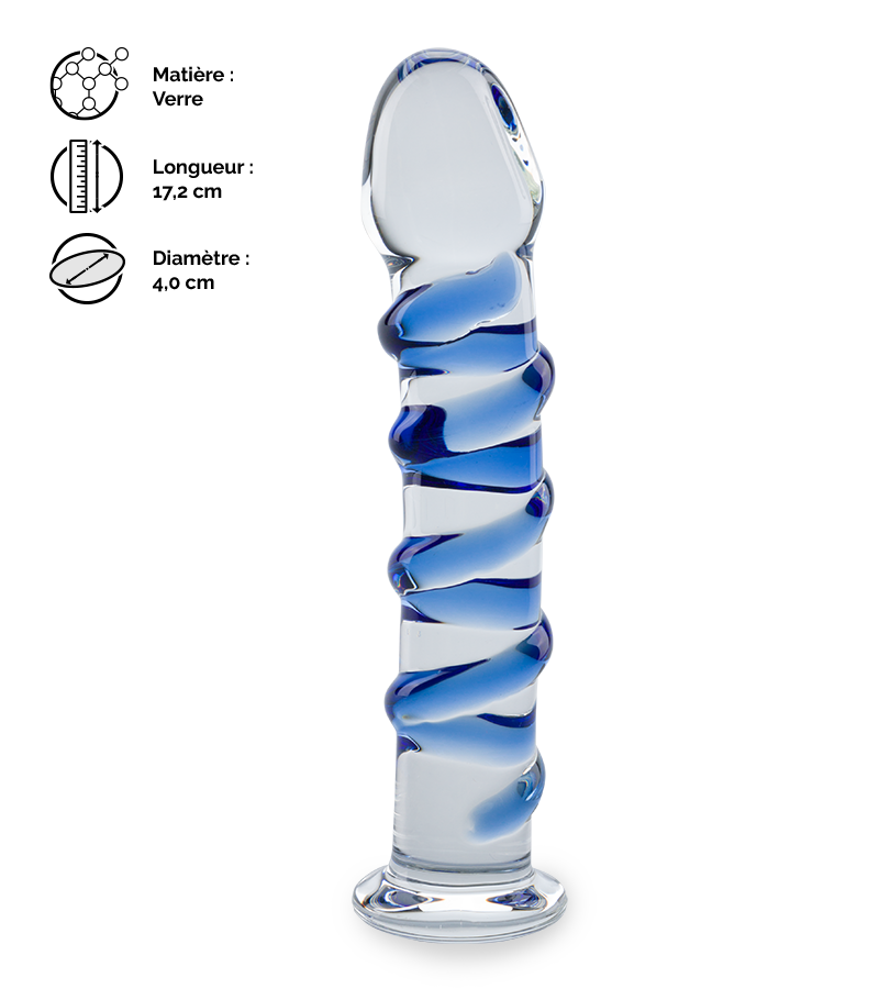 Ce jouet en verre est hypoallergénique, facile à nettoyer et vous offrira de toutes nouvelles sensations. Entièrement transparent, une courbe teintée en bleu tourne habilement tout autour. Ce relief tournoyant accentuera le mouvement des va-et-vient, massant délicatement votre intimité. De par sa fabrication en verre, vous pourrez l’immerger dans de l’eau tiède ou froide pour en changer la température : un effet chaud ou rafraichissant sera surprenant et excitant lors de la pénétration !