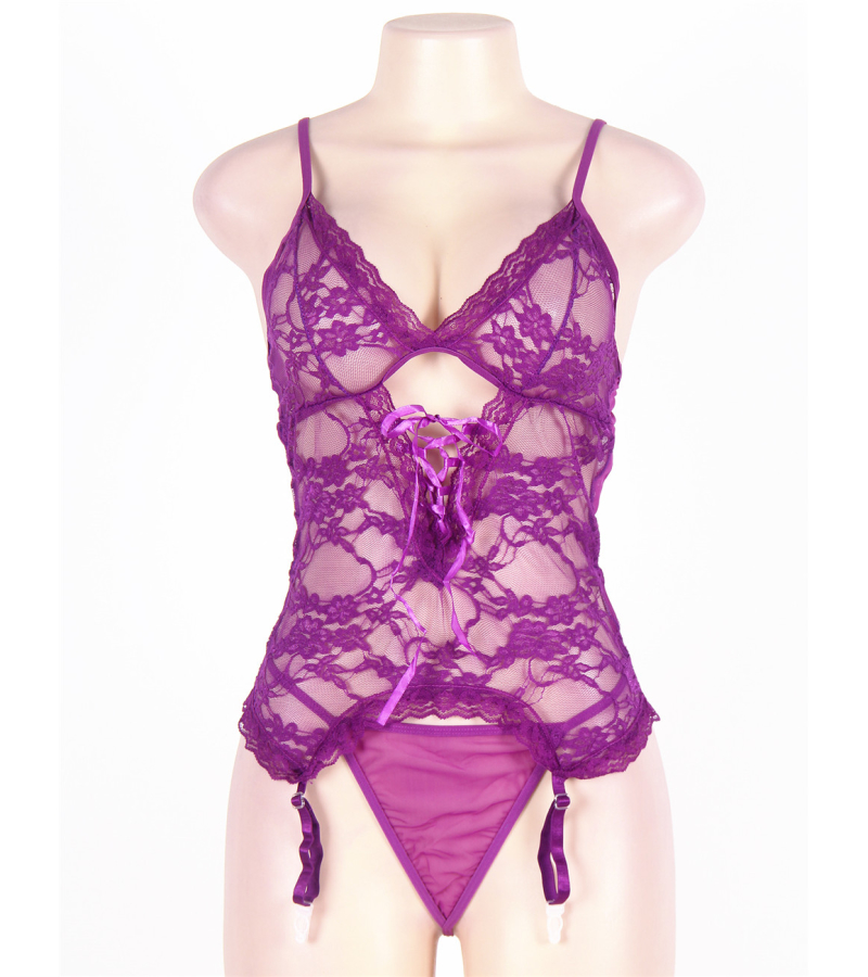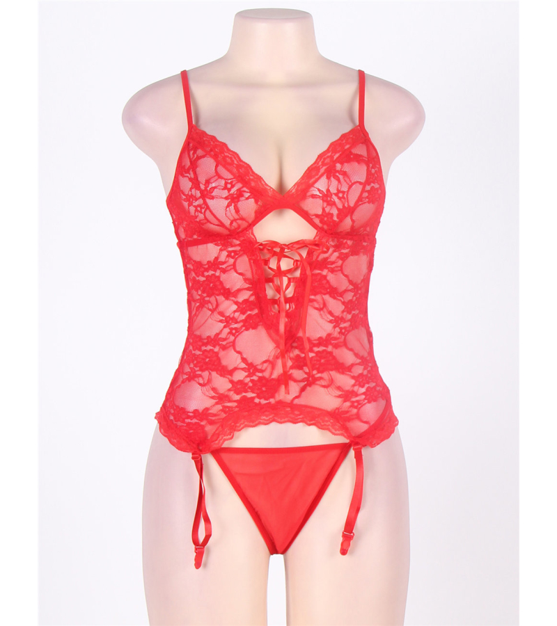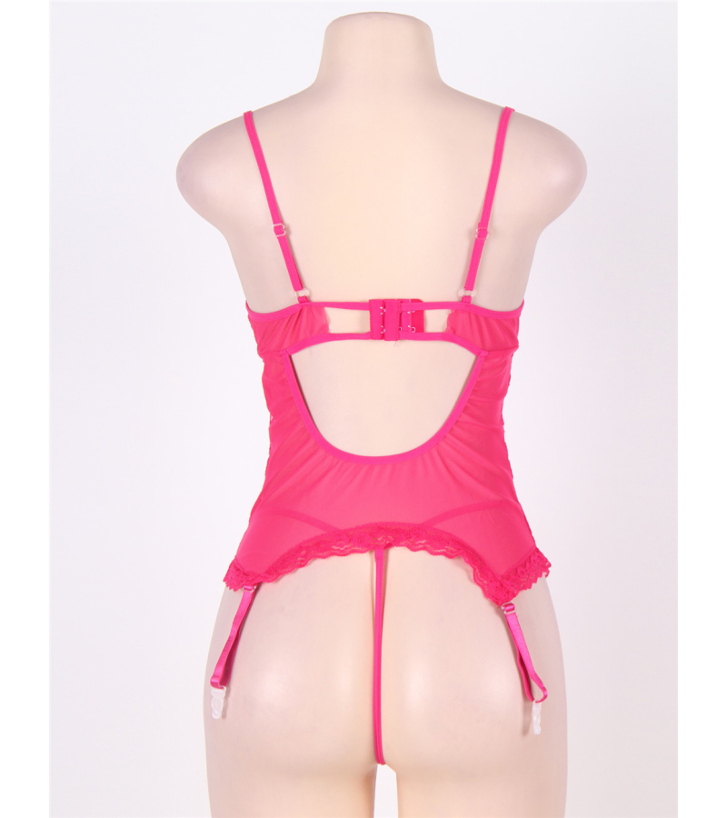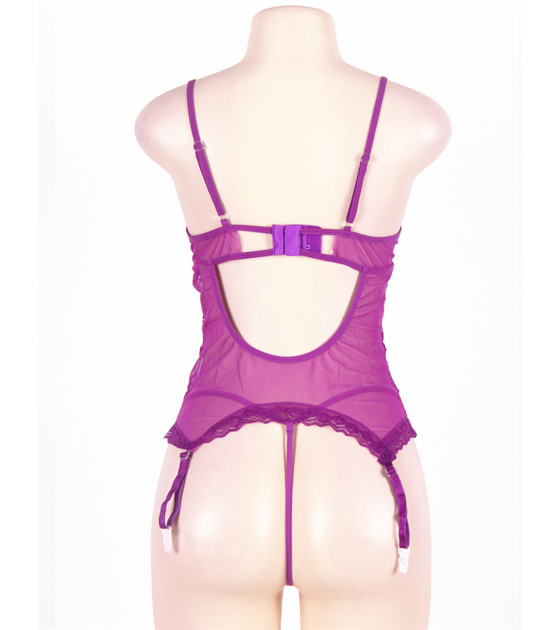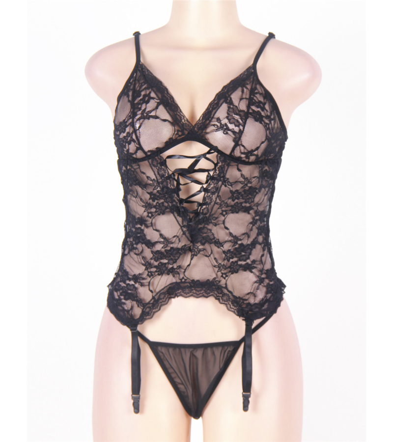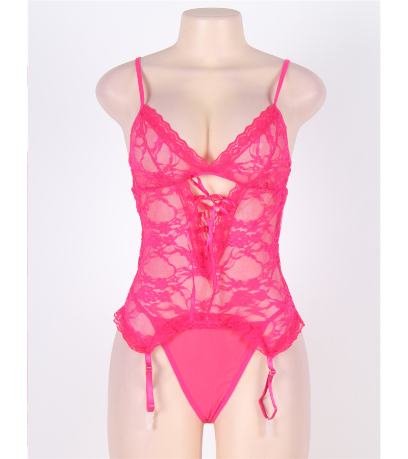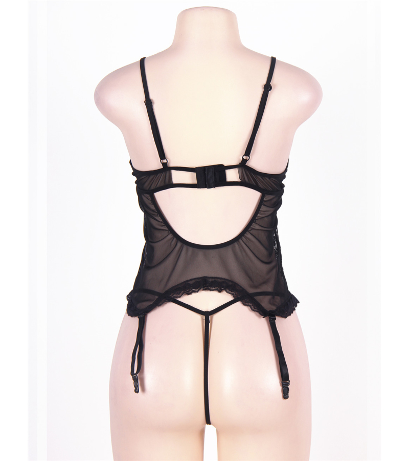 La guêpière body nuit sauvage est une lingerie coquine simple mais ô combien efficace. Cette guêpière entoure le buste avec précision et propose un double décolleté (par le haut et par le bas) pour mettre en valeur votre poitrine. Le corset en tissu transparent est décoré de nombreux motifs divers et variés. De dos, ce bustier dévoilera vos fesses et votre chute de reins. Détail coquin, cette guêpière sexy est livrée avec un string assorti et des menottes de poignet en tissu assorti.