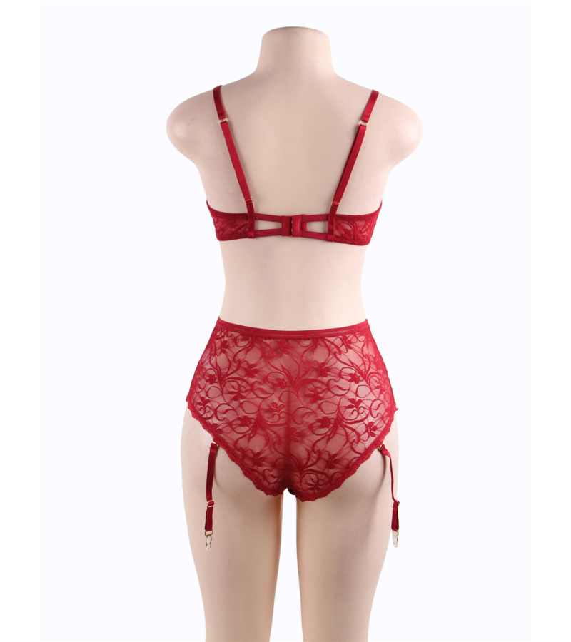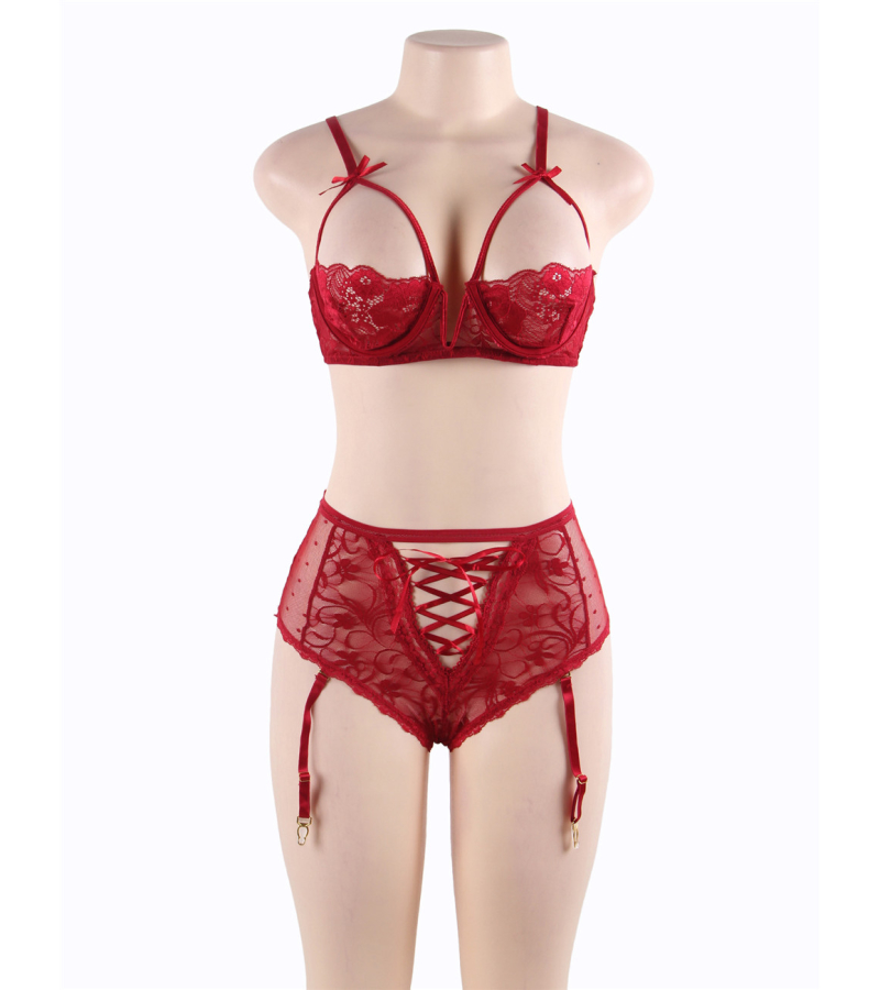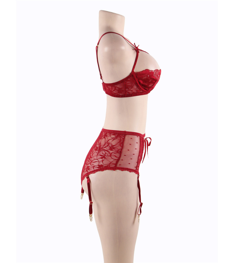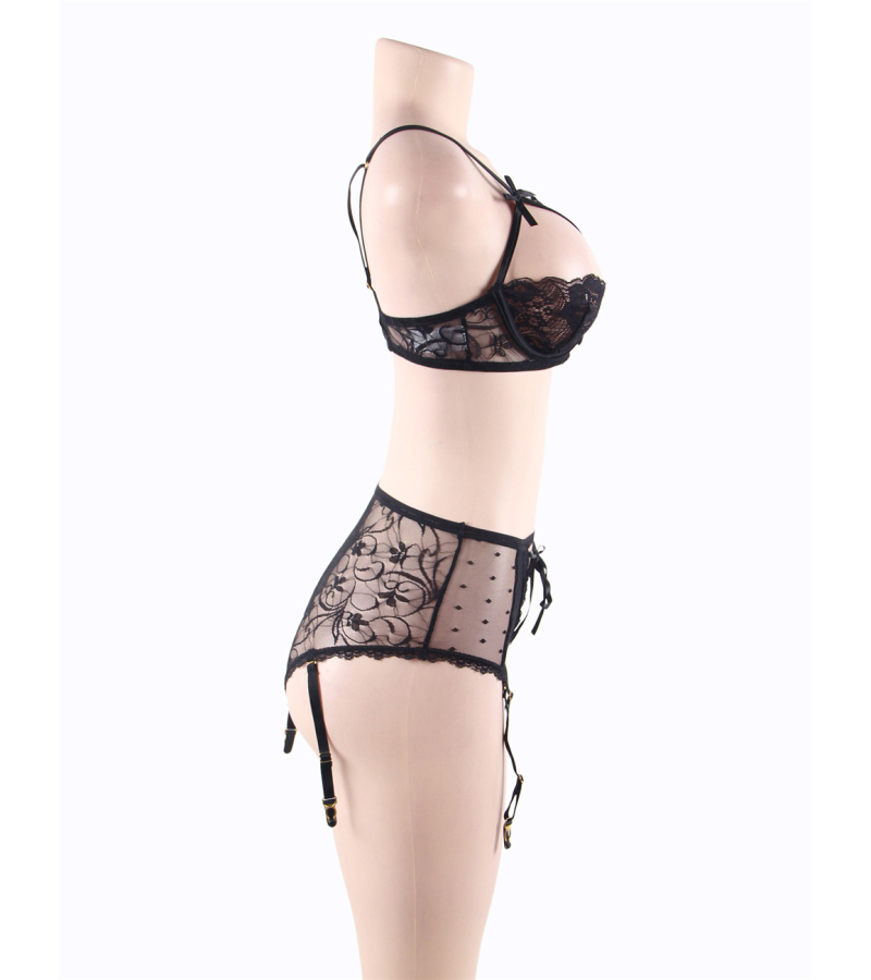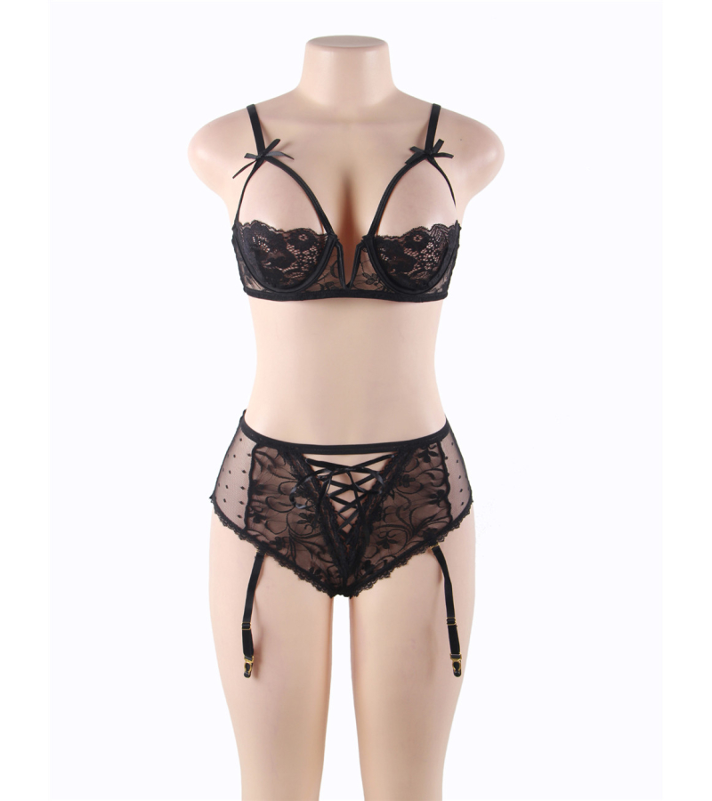 Cette lingerie est un ensemble deux pièces auquel peut être lié des bas (non inclus). Le délicieux soutien-gorge en dentelle est ponctué de petits nœuds coquins. Le panty culotte lui montera jusqu’au-dessus du nombril pour envelopper entièrement les hanches. Un laçage serré laissera apparaître quelques zones charnelles entre le pubis et le nombril, un laçage qui se termine par un nœud. Confectionné dans un tissu légèrement transparent, cette lingerie est décorée de nombreux motifs variables qui ne manqueront pas de s’harmoniser avec vos formes. Cet ensemble coquin deux pièces est disponible en plusieurs couleurs et plusieurs tailles, notamment en grande taille.