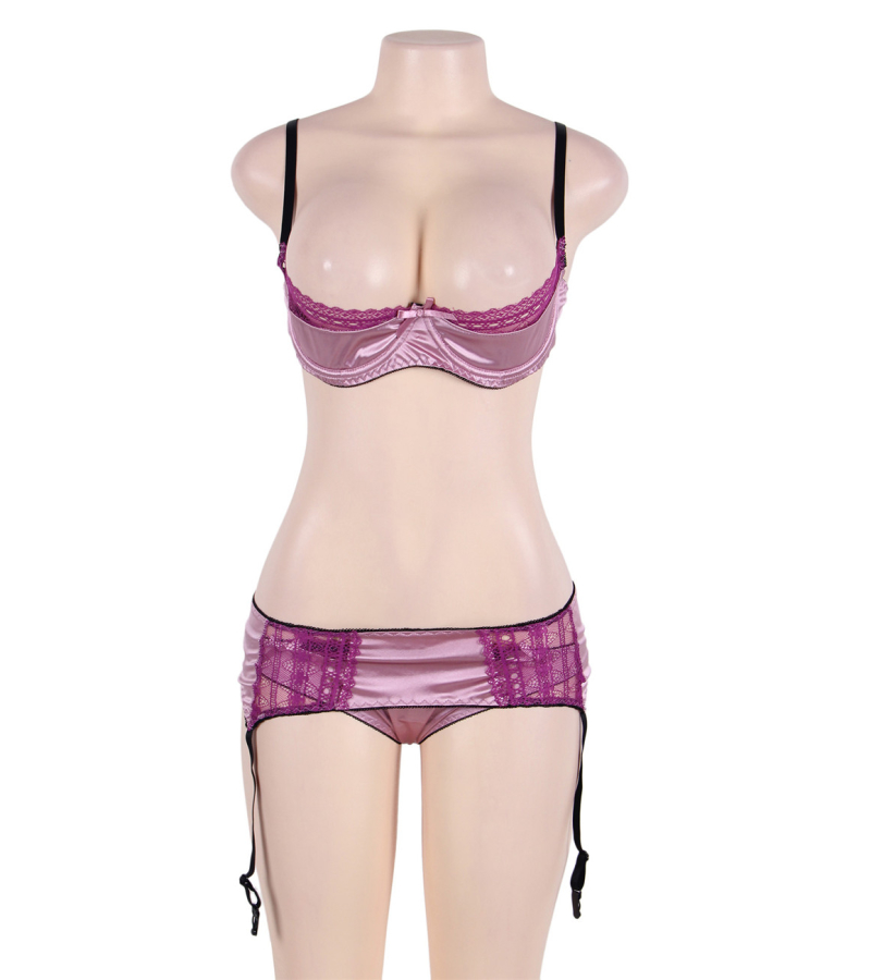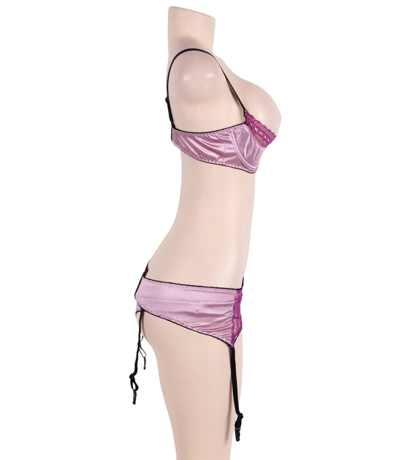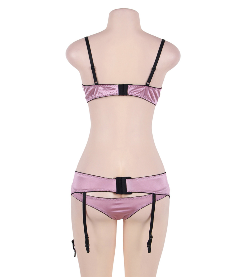 En dévoilant et en galbant votre poitrine, cette ensemble sexy multiplie votre pouvoir de séduction. Élégant et sexy, il sublimera vos hanches de la plus belle des manières grâce à un porte-jarretelles en satin très érotique auquel vous pourrez attacher une paire de bas (non fournis). Les trois pièces sont confectionnées dans un tissu rose à effet satin ponctué par des zones de dentelle.