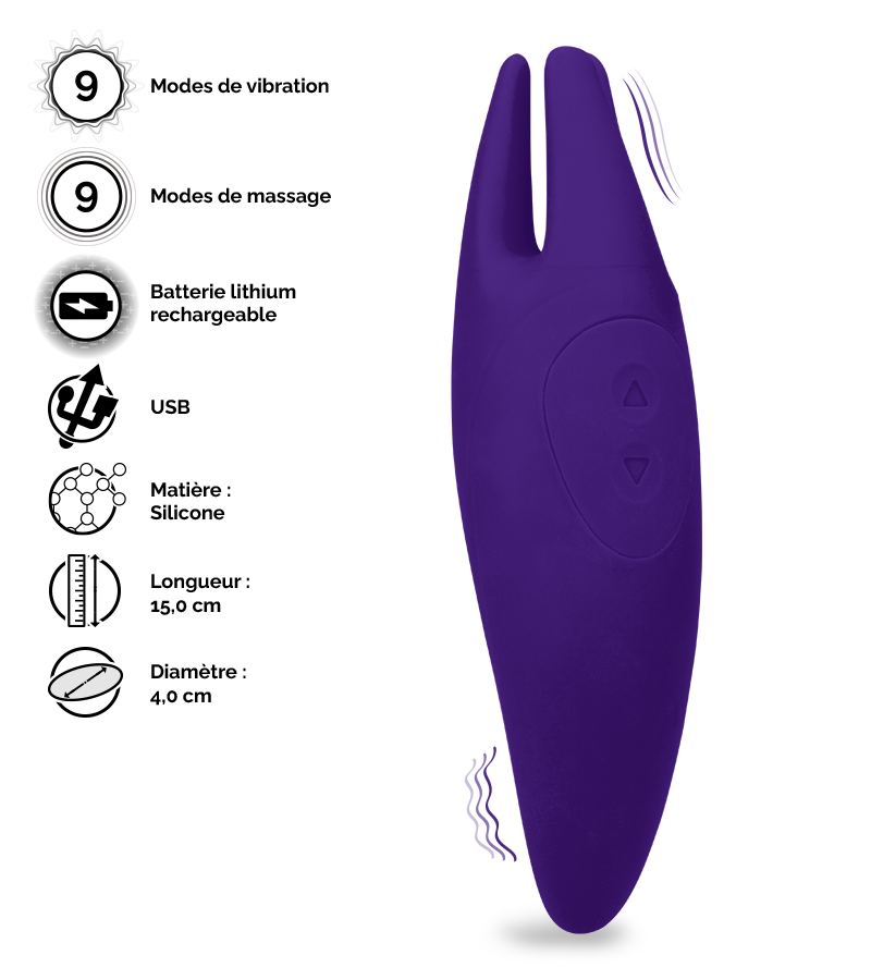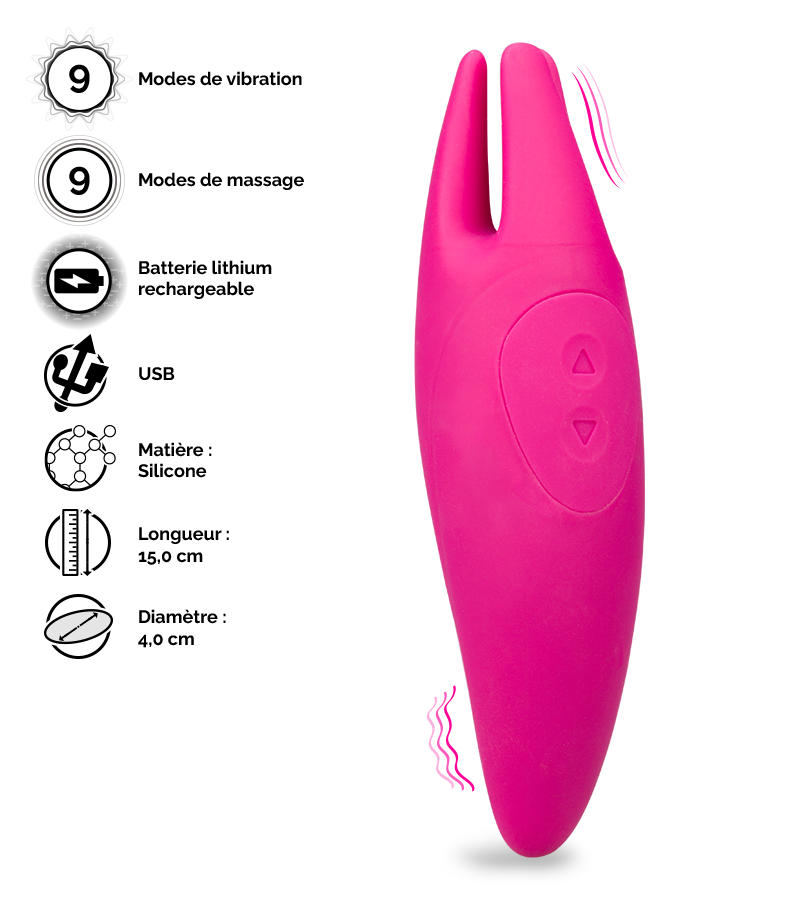Ce sextoy surprenant et très efficace saura exactement comment s’occuper de vous. Ces trois branches souples s’activeront autour de votre clitoris pour lui faire profiter de massages irrésistibles. Vous pourrez aussi ajouter des vibrations pour atteindre un plaisir incomparable. Vous ne pourrez jamais vous lasser grâce aux 9 modes de massages et aux 9 modes vibrants contrôlables de manière indépendante, vous trouverez forcément une nouvelle façon de vous faire décoller. Tout doux et ergonomique, ce masseur est très agréable à utiliser et deviendra vite un compagnon indispensable.