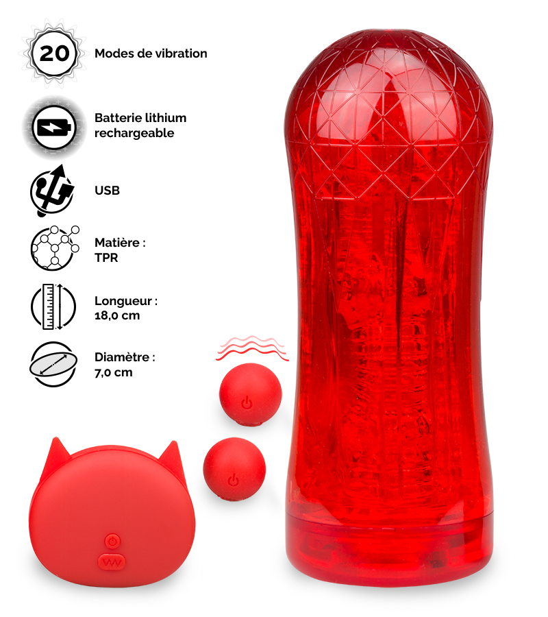 Ce sera à vous de décider si vous souhaitez l’utiliser sans les boules, pour plus de discrétion par exemple, ou avec celles-ci, ajoutant ainsi des vibrations. Grâce aux 10 modes de vibrations, contrôlables à distance avec la télécommande sans fil, vous pourrez ressentir diverses sensations vous parcourir, jusqu’à atteindre l’orgasme. La gaine de ce sextoy est à la fois nodulée et striée : chaque relief sera des plus agréables au contact de votre pénis. Son diamètre s’étend légèrement pour s’adapter à vous et vous offrir une sensation très réaliste. Placez les boules sur un côté ou vers le bas, entre la gaine et son boîtier, pour faire varier les plaisirs !