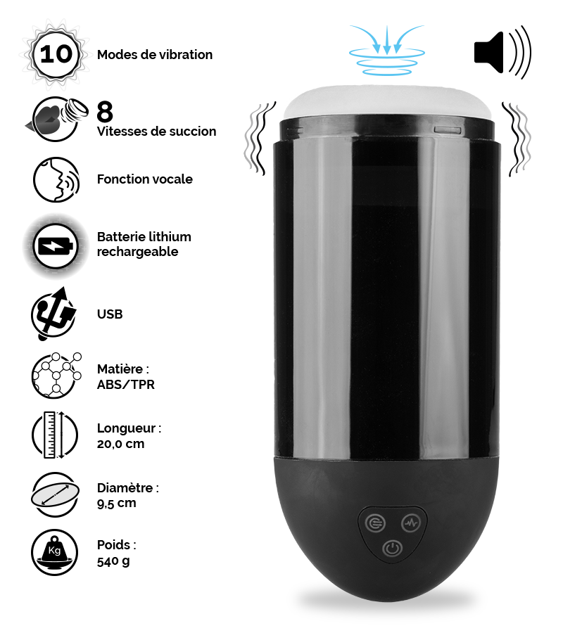 Ce masturbateur très sobre et élégant risque de vous surprendre par son grand confort et son efficacité redoutable. En ouvrant son couvercle, vous découvrirez une gaine très douce et confortable à la texture nodulée très accueillante. Vous pourrez profiter de massages vibrants tout en découvrant des sensations d’aspiration qui ne vous laisseront pas indifférent. Bullet Cup ne vous laissera jamais vous lasser de lui grâce à ses 10 modes vibrants et à ses 8 modes d’aspiration qui vous offriront la possibilité de varier les plaisirs. Et pour ceux qui ont besoin d’une stimulation auditive pour se mettre dans l’ambiance, vous pourrez brancher votre casque ou vos écouteurs dans sa prise jack et ainsi écouter des gémissements féminins dans trois langues (anglais, japonais et chinois). Le masturbateur Bullet Cup mesure 20,0 cm de long et 9,5 cm de diamètre. Sa gaine interne est profonde de 10,0 cm et son diamètre d’insertion est de 6,0 cm maximum. Vous pourrez recharger votre masturbateur avec le câble USB fourni.