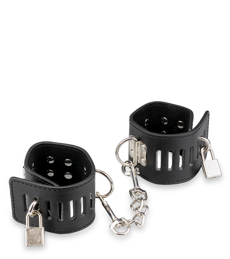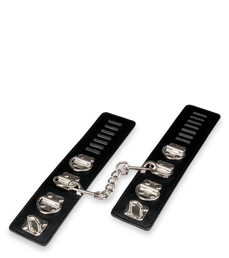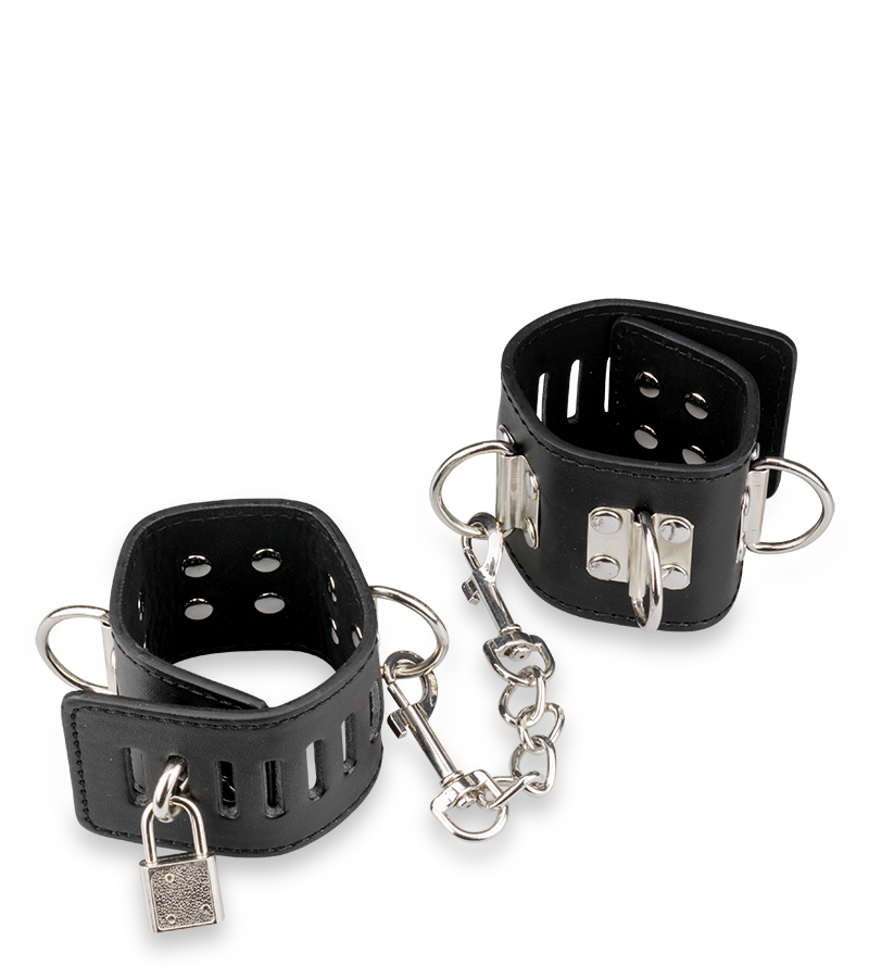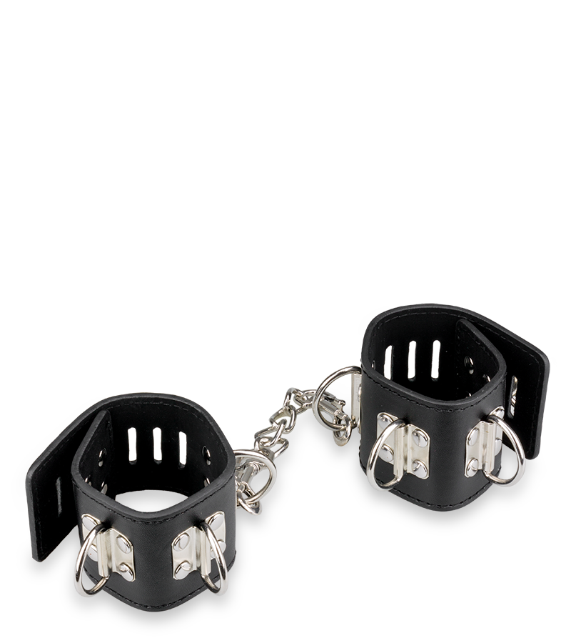 Cette paire de menottes poignets cuir et métal s’adaptera parfaitement aux poignets de votre partenaire. Réglables, ces menottes sont confortables (similicuir) et composées de rivets en métal. Véritable basique des jeux SM, cette paire de menottes deviendra un incontournable pour vos ébats sexuels. Elle est munie d’une chaine amovible reliant les anneaux de bondage de chaque menotte. Chaque menotte fait 24,8 cm de long et 5,4 cm de large. La chaine fait 15,0 cm de long.