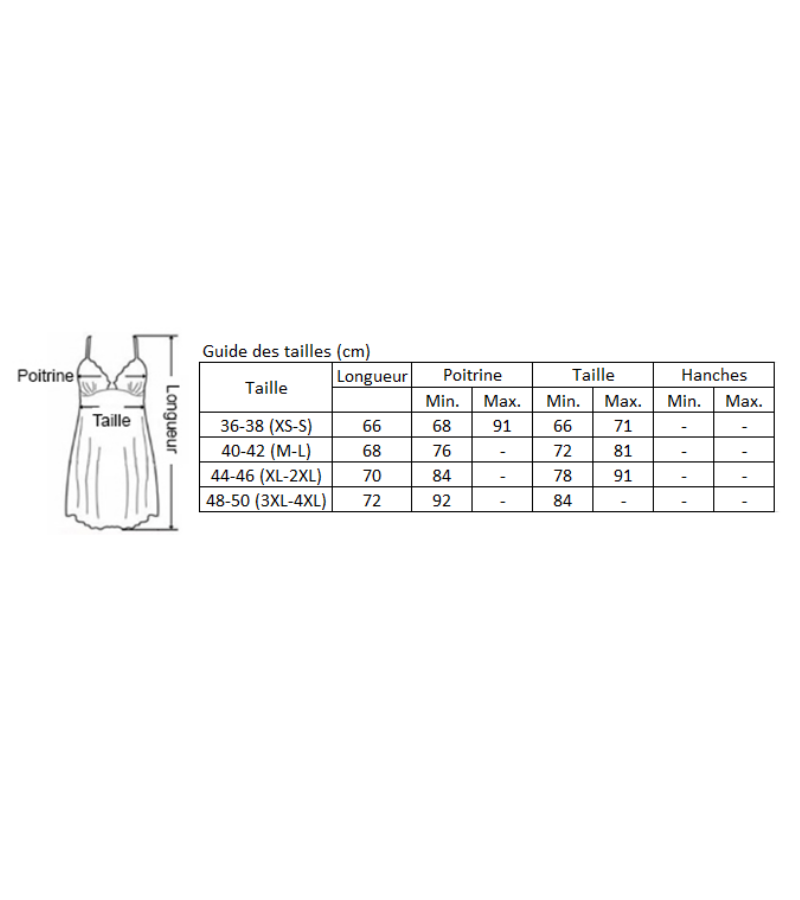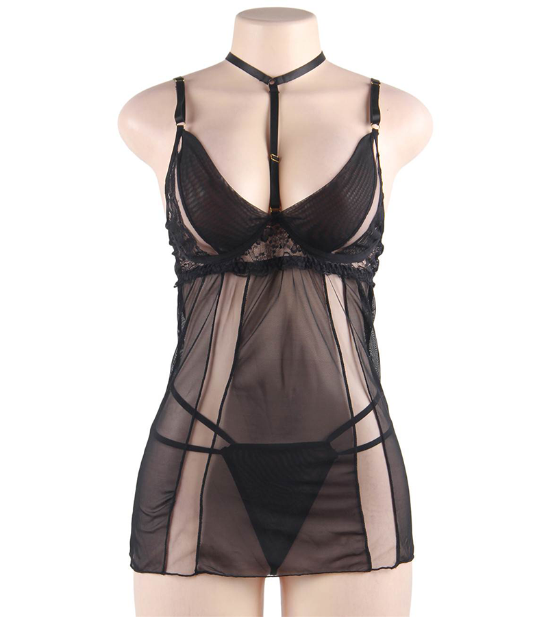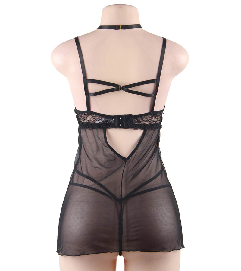 Cette nuisette sexy femme joue avec les matières et alterne entre maille fine, bandes transparentes et détails dentelle de façon à sublimer vos courbes. Le beau décolleté rehaussé d’un col original avec un effet collier. Au dos vous trouverez des brides et une agrafe réglable pour adapter cette tenue à votre silhouette. Cette nuisette transparente peut se porter avec le string qui l’accompagne ou seule pour dévoiler encore plus votre corps et provoquer le désir.