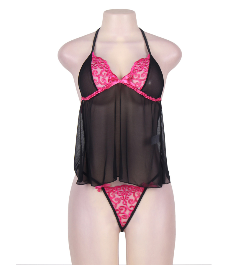 Cette lingerie marie le rose et le noir, deux couleurs sensuelles, à la perfection. Très courte, elle laisse apparaitre vos fesses et vos jambes pour un rendu des plus sexy. Tout comme la poitrine, le string est décoré de dentelle rose ponctuée de légers rubans à effet satin. Jusque dans les moindres détails, cette nuisette est conçue pour vous sublimer et révéler la femme fatale qui est en vous.