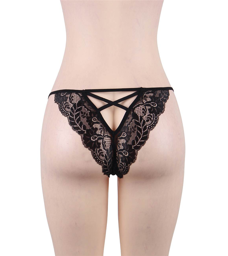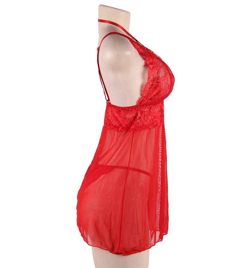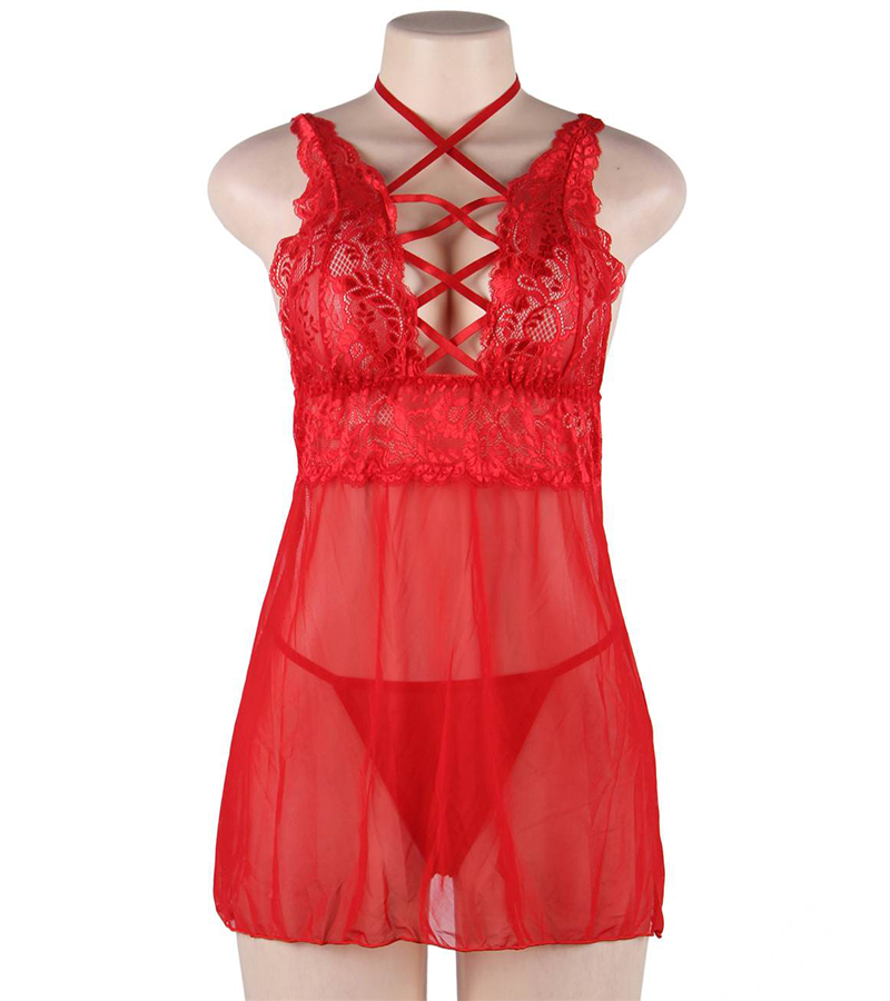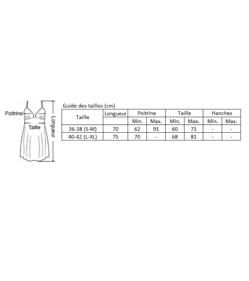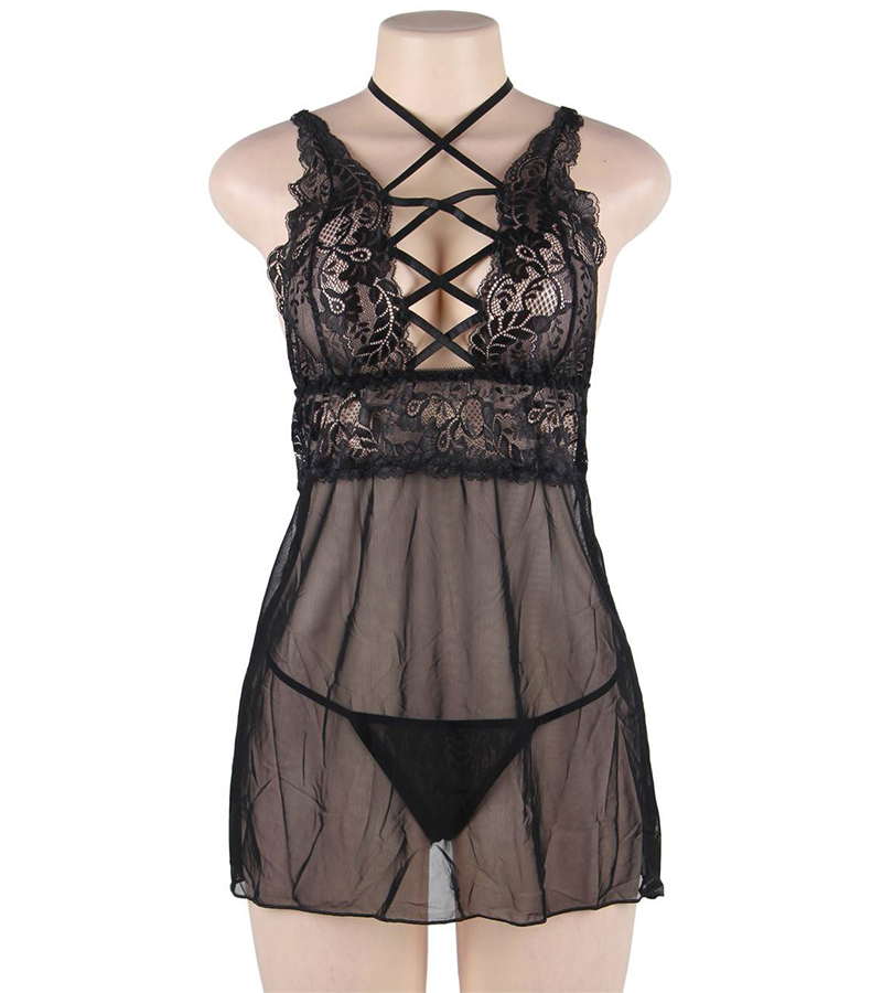 Le jeu de lacets au niveau du décolleté remonte jusqu’au cou et vient mettre en valeur votre poitrine, elle-même soulignée par de la dentelle et une bande élastiquée pour encore un meilleur maintien. La maille fine transparente de cette nuisette laisse entrevoir vos formes et le tanga en dentelle avec des brides croisées à l’arrière. Les bretelles réglables permettent de l’ajuster à votre morphologie.