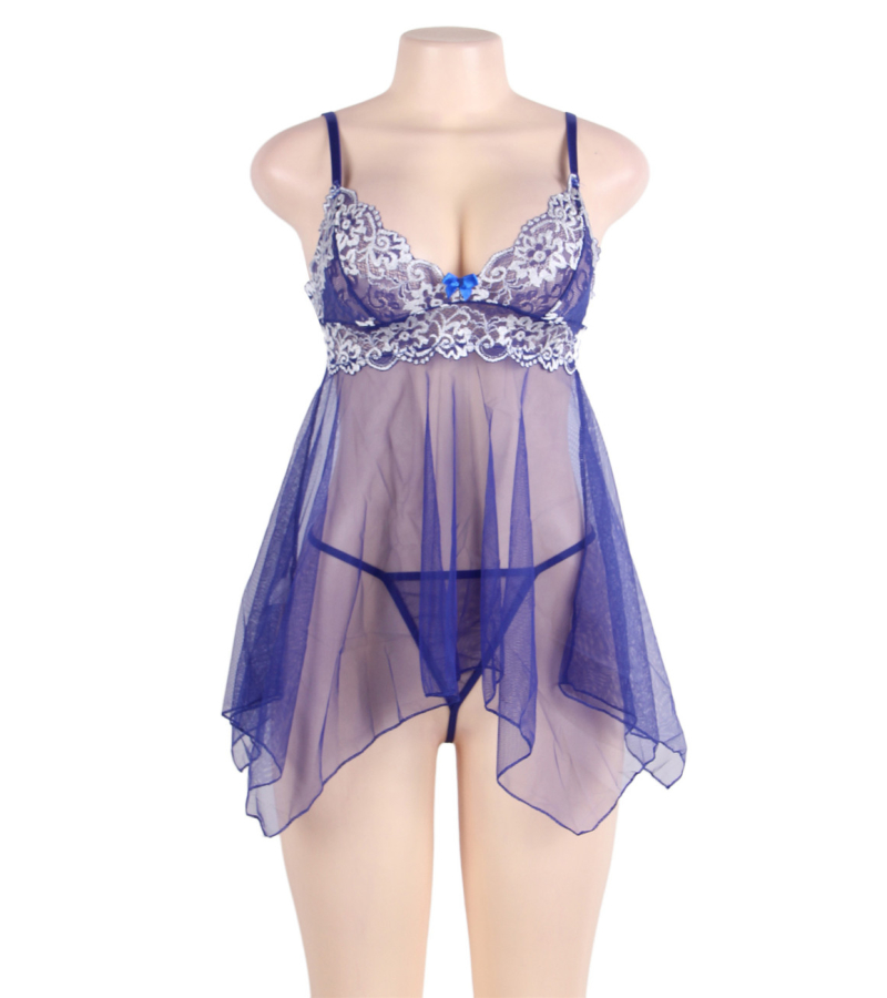 Avec son décolleté échancré qui dévoile une superbe dentelle brodée blanche et violette, cette nuisette transparente laisse arborer une poitrine voluptueuse et délicieusement galbée. Un petit nœud bleu est positionné entre la poitrine, ce qui ne manquera pas d’attirer l’attention de votre homme. Le voile transparent qui descend sur votre corps révèle vos formes et met tous vos atouts en évidence.