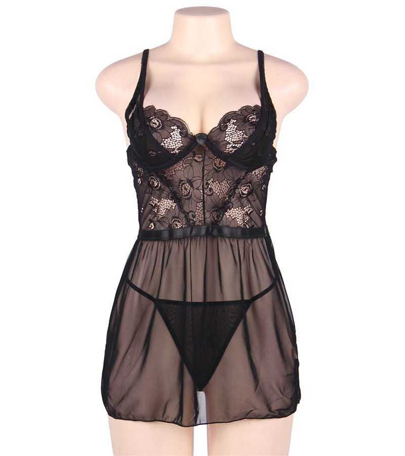 Resserrée à la taille par une bande satinée, elle vous sied à merveille et met en valeur vos hanches aux courbes sensuelles. La poitrine agrémentée de baleines et le buste sont en dentelle alors que la nuisette est en maille transparente, à partir de la taille, de façon à dévoiler subtilement le string ou vos parties intimes. Le dos légèrement ouvert se ferme avec une agrafe 3 positions. Les bretelles sont réglables pour s’adapter au mieux à votre morphologie. La nuisette est livrée avec un string assorti. Elle est conçue en maille 91 % polyester, 9 % élasthanne et dentelle 89 % nylon, 11 % élasthanne. Elle est disponible en grande taille.