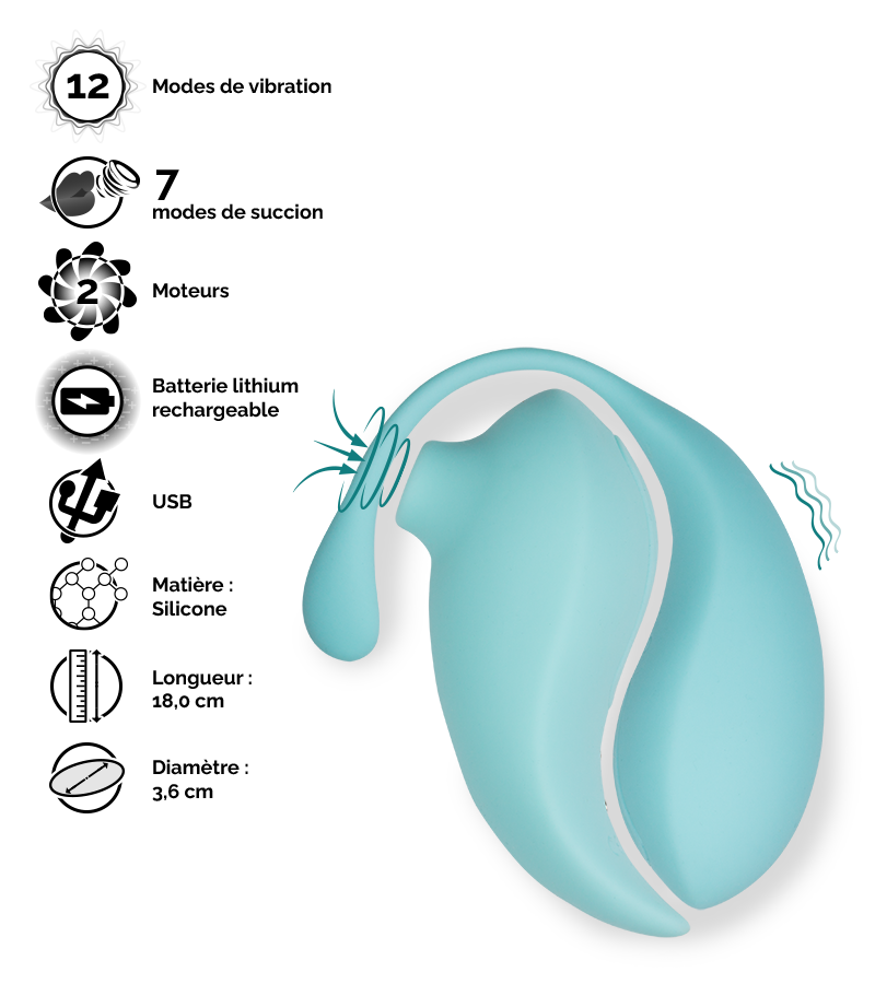Cet œuf vibrant possède des courbes parfaites pour masser votre point G comme personne au rythme du mode choisi parmi les 12 modes de vibrations proposés. Et parce qu’une double stimulation en vaut mieux qu’une, cet œuf vibrant est accompagné d’une télécommande qui pourra venir aspirer votre clitoris si vous le souhaitez. Ce système d’aspiration augmente la pression sanguine dans votre clitoris pour booster votre excitation et votre sensibilité. Son petit bec suceur est également équipé de petits picots souples en silicone qui viendront chatouiller votre clitoris. Vous pourrez également choisir de faire l’impasse sur la stimulation clitoridienne pour profiter d’un moment complice avec votre partenaire en lui donnant la télécommande et en le laissant prendre le contrôle de votre plaisir.