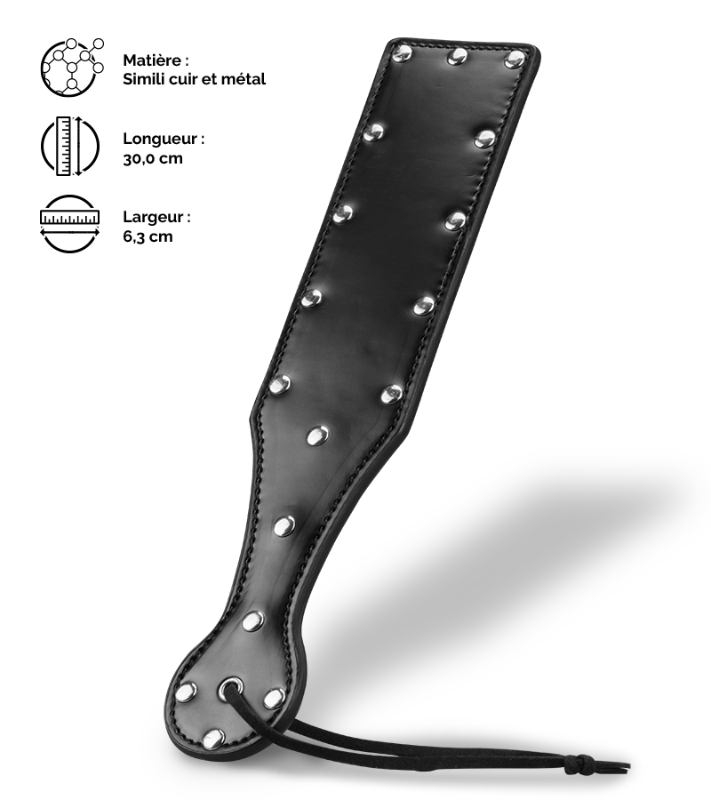 Le paddle BDSM noir cuir et rivets mesure 30,0 cm de long et 6,3 cm de large.