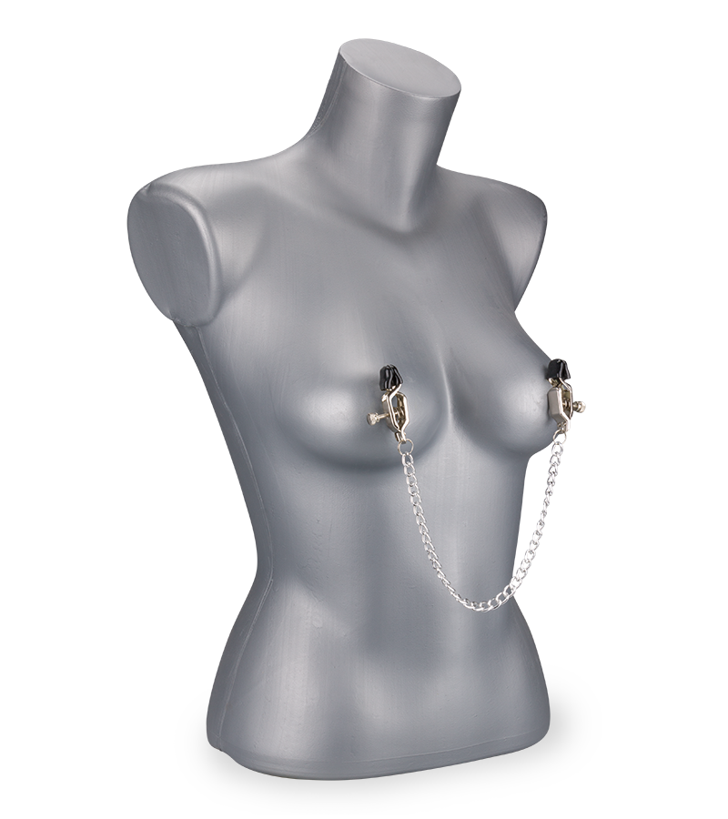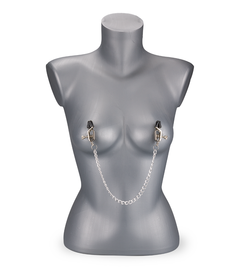 Ces deux pinces ont été conçues pour pincer fortement vos tétons. En tournant les vis présentes sur les pinces, vous pourrez accentuer ce pincement pour des sensations encore plus intenses. De plus, la chaine qui relie les deux pinces vous donnera un look BDSM très excitant, elle caressera votre poitrine à chacun de vos mouvements.
