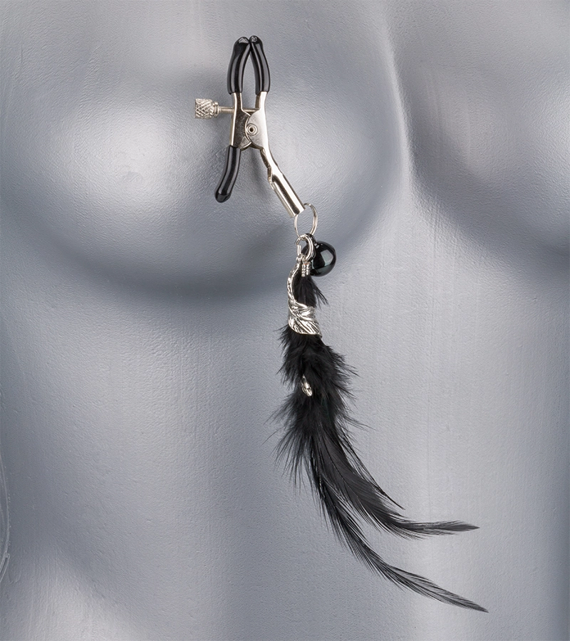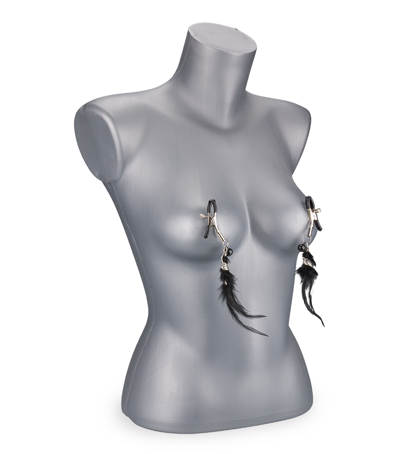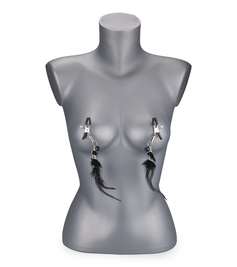 Ces deux pinces sont idéales pour les personnes souhaitant s’initier en douceur au BDSM. Elles exercent une pression très excitante sur le téton que vous pourrez moduler grâce aux vis. Leur design très travaillé ne laissera personne indifférent, elles habilleront votre poitrine à la perfection. Elles possèdent des grelots qui tinteront à chacun de vos mouvements et des plumes qui caresseront subtilement votre peau pour une excitation maximale.