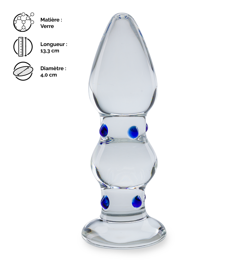 Ce jouet sexy entièrement pensé pour votre plaisir sera le meilleur allié de vos moments dédiés à la stimulation anale. Ce plug en verre au design épuré et travaillé se compose de trois parties principales avec une extrémité profilée permettant une insertion facilitée, un centre arrondi agrémenté de huit petites boules bleues en reliefs et enfin, une base assez et plate. Cette base permet de profiter du plug anal en verre Gem en toute sécurité et sans aucune crainte.