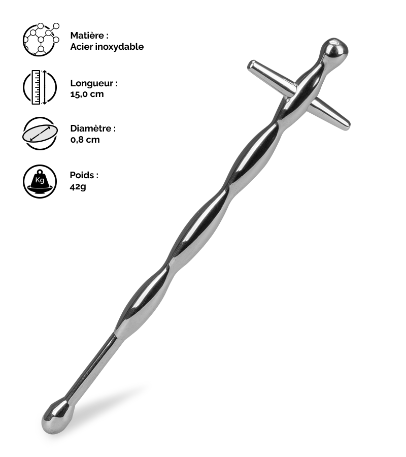 Le plug d’urètre long Sword mesure 15 cm de longueur totale dont 12,5 cm insérables. Son diamètre est de 0,8 cm au point le plus large.