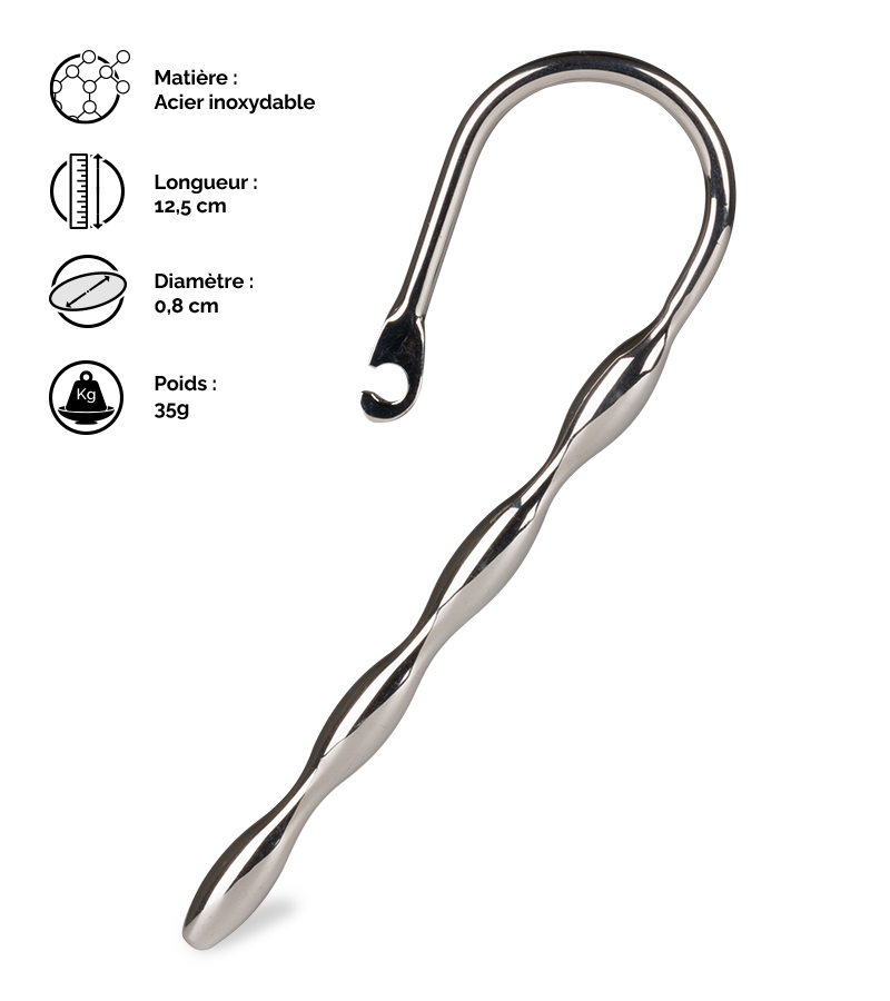 Le plug Keepi possède une longueur ondulée afin de vous offrir des sensations encore plus fortes. Il mesure 12,5 cm de longueur totale dont 9,5 cm insérables. Le diamètre du plug est de 0,8 cm à son point le plus épais. Deux anneaux de deux tailles différentes sont fournis : 2,5 cm et 3,0 cm.