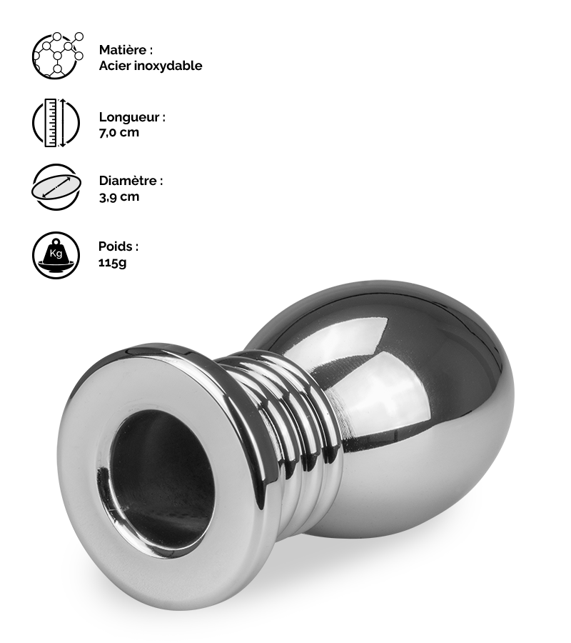 Ce plug en acier inoxydable est parfait pour vous procurer des sensations intenses. Il peut être immergé dans l’eau tiède ou froide pour le mettre à température et varier les plaisirs. Il possède un tunnel en son centre qui permettra à votre partenaire d’avoir une vue imprenable sur votre intimité. Mais ce tunnel peut également servir à faciliter vos lavements et ainsi profiter d’une hygiène anale irréprochable.