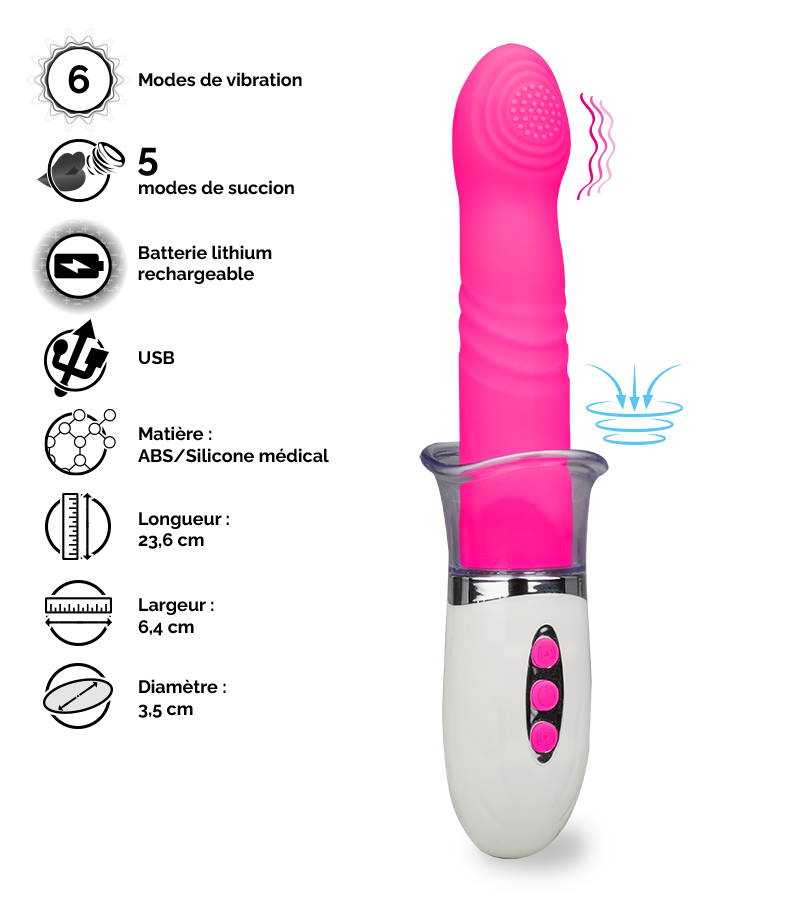 C’est un large éventail de possibilités que vous offre la pompe à vulve avec vibromasseur 3-en-1. Cette pompe à vulve sert bien entendu à provoquer une aspiration au niveau de la vulve, mais également de la poitrine grâce à un système proposant cinq aspirations différentes. Il est également possible d’installer un vibromasseur long de 15,2 cm sur la base pour pouvoir jouir de l’un des 6 modes de vibrations disponibles. Le plaisir vaginal est alors total et peut être combiné à la sensation d’aspiration lors de la pénétration. En plus de tous les plaisirs rendus possibles par ce sextoy, la stimulation clitoridienne n’est pas en reste grâce à la présence à l’extrémité du vibromasseur de nombreux picots.