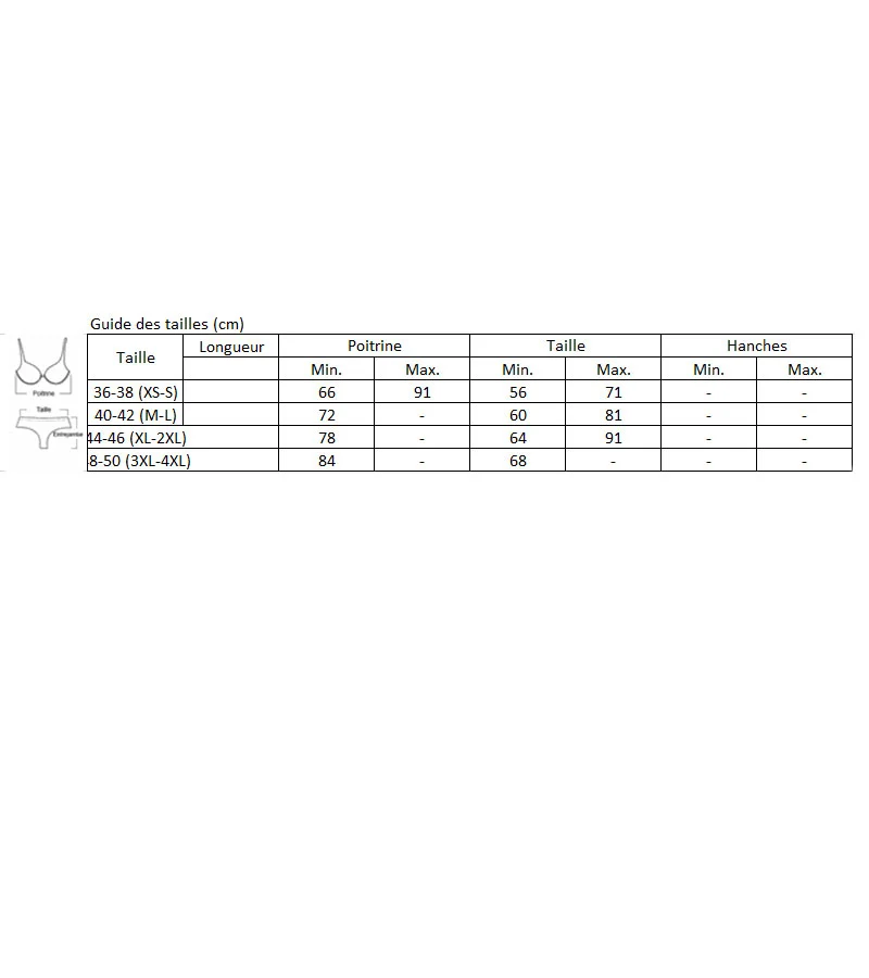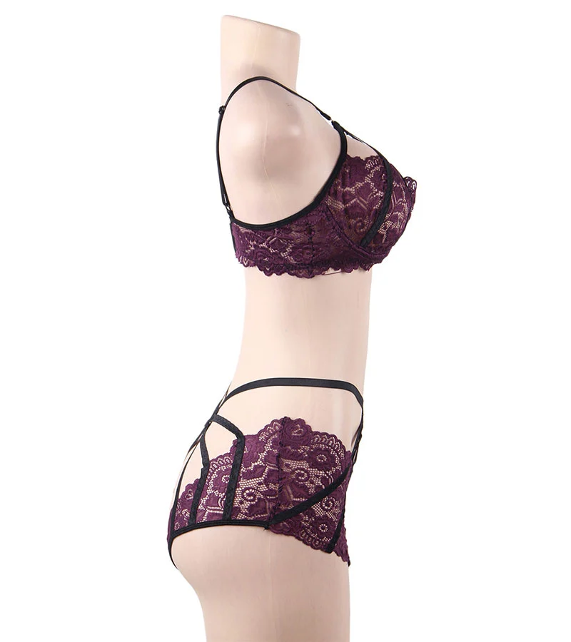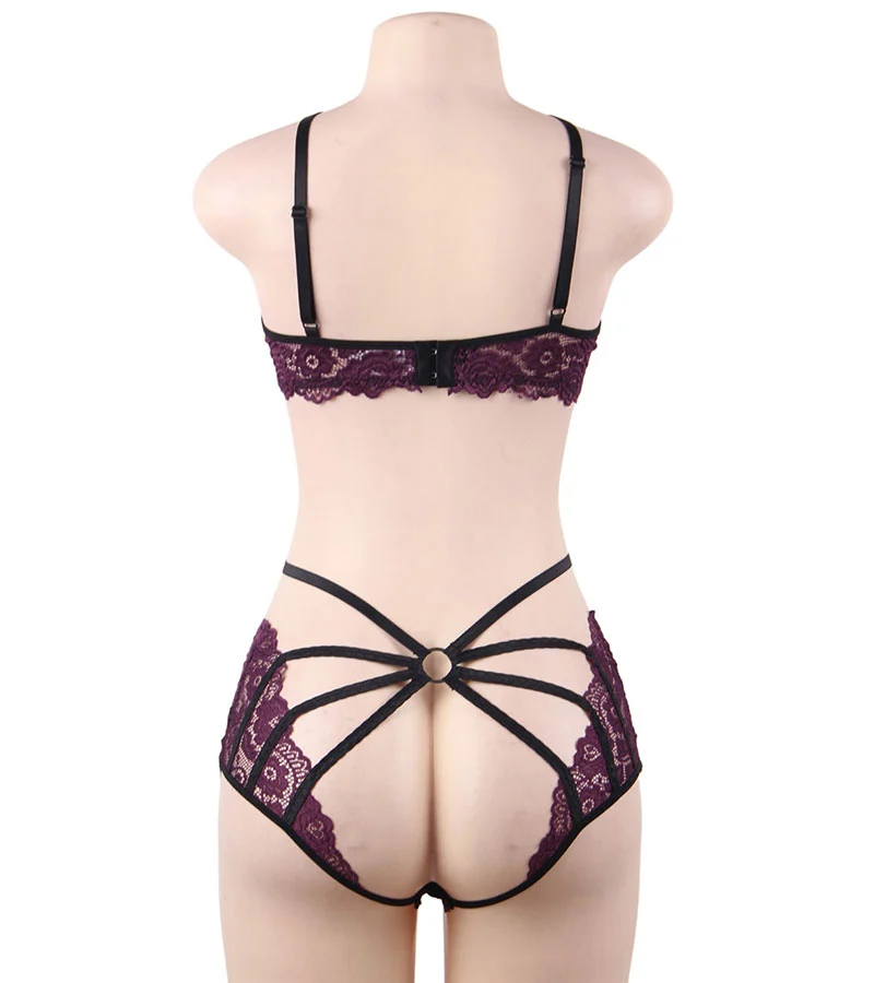 La culotte et le soutien-gorge sont confectionnés dans une magnifique dentelle à motifs floraux pourpres agrémentée de nombreuses lanières noires ressemblant à une toile d’araignées. L’ensemble de sous-vêtements coquins araignée pourpre en dentelle raffinée se compose de deux pièces, une culotte et un soutien-gorge. La culotte large a un effet descente en V qui s’arrête sur votre pubis juste en-dessus de votre intimité, à l’arrière, elle est complètement ouverte et montrera votre délicieux fessier à votre partenaire qui ne se lassera jamais de cette vue. Elle tient grâce aux lanières noires qui se rejoignent en bas du dos à l’arrière et au niveau du nombril à l’avant. Ces lanières rendent vos hanches irrésistiblement sexy. Le soutien-gorge assorti à armature renforcée est également ponctué par ces lanières noires du plus bel effet. Les lanières traversant la poitrine trois par trois offrent un joli décolleté profond et se joignent en dessous du cou, façon collier. Cette lingerie érotique est notamment disponible en grande taille (en fonction des stocks disponibles).