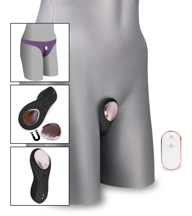 2. Placez le stimulateur dans la culotte, la partie aimantée vers le haut puis placez l’aimant devant la culotte sur la partie aimantée