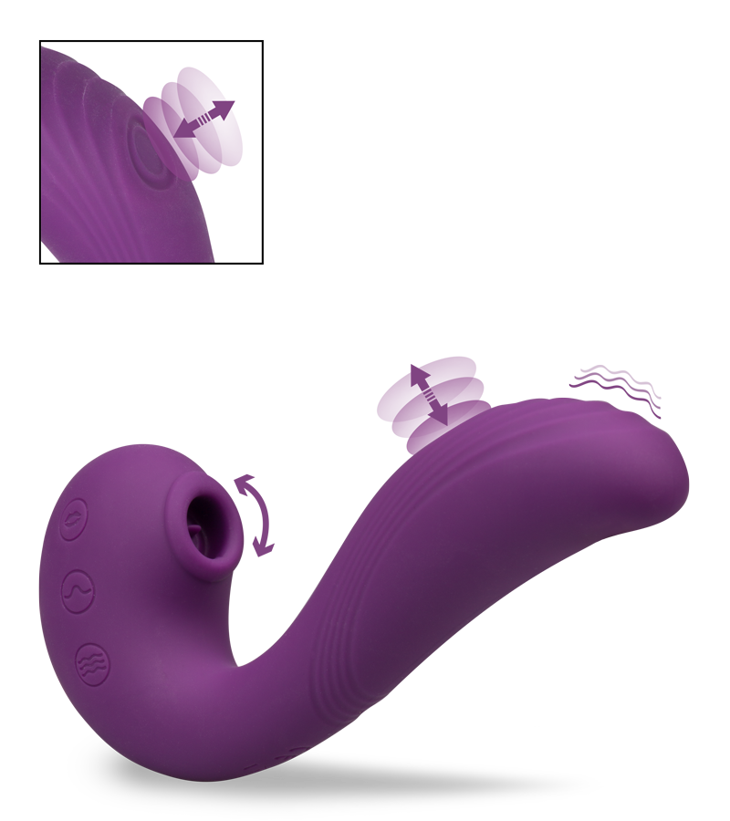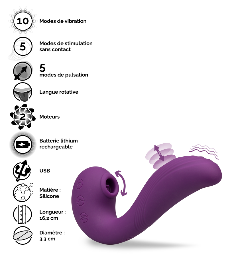 Ce sextoy ultra complet en silicone possède toutes les options pour vous faire passer un moment sensuel et intense. Il possède un bec spécialement conçu pour le clitoris qu’il viendra stimuler grâce à de l’air pulsé et une petite langue vibrante. Sa partie insérable est vibrante pour masser en profondeur le vagin, de plus, elle comporte une petite zone de pulsations localisée pour venir cibler précisément le point G. Pour varier les sensations, Absolute vous propose 5 modes de stimulation du clitoris, 10 modes de vibrations et 5 modes de pulsations.